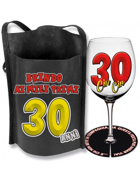 Appendi al collo del protagonista della serata questa busta in TNT porta bicchiere stampata con la frase "Brindo ai miei primi 30 anni", che contiene il calice in vetro da 300 mi., con la scritta 30 Cin Cin, e alla base dello stelo, completa il tutto un salvagocce stampato con la scritta: E chi non beve in compagnia da questa festa può andar via.