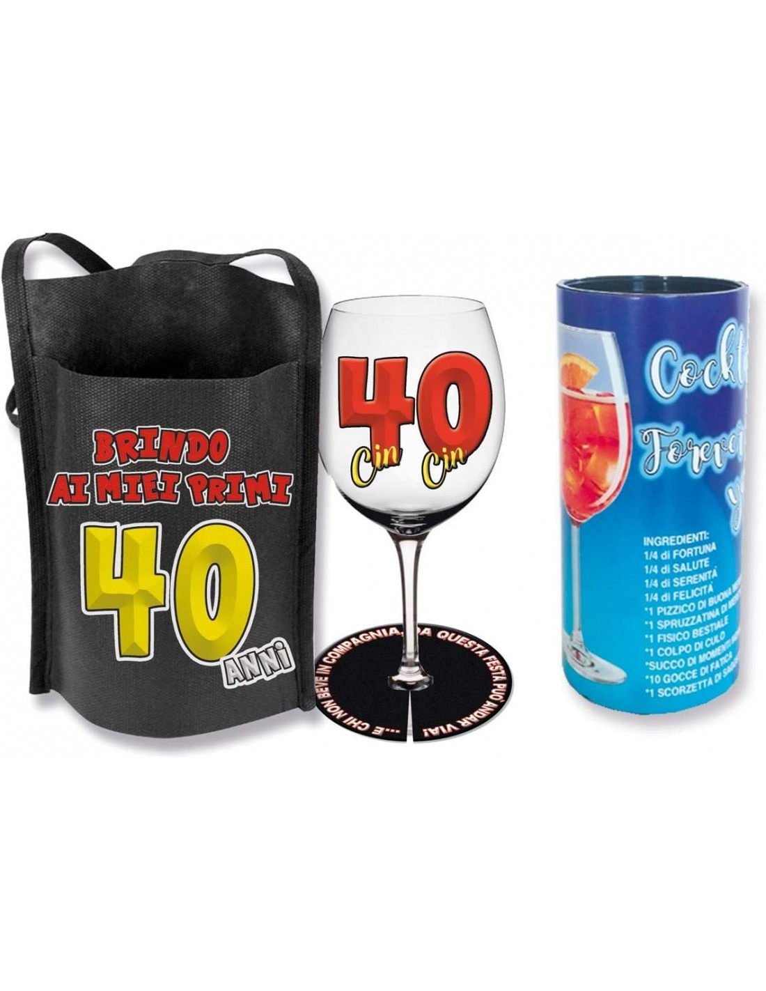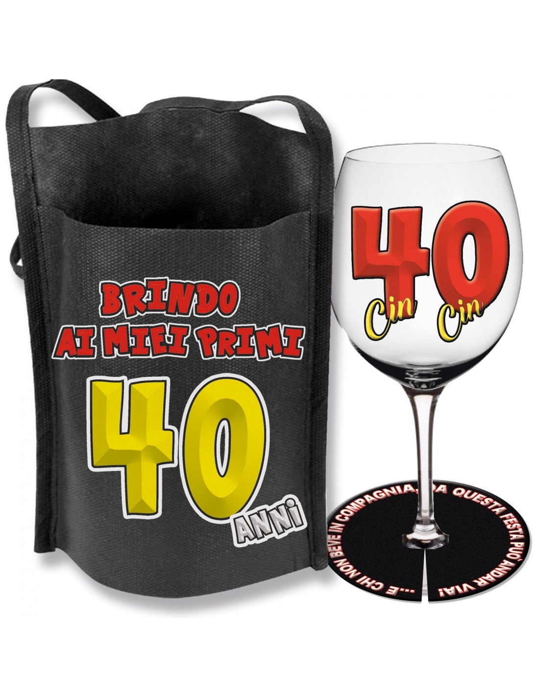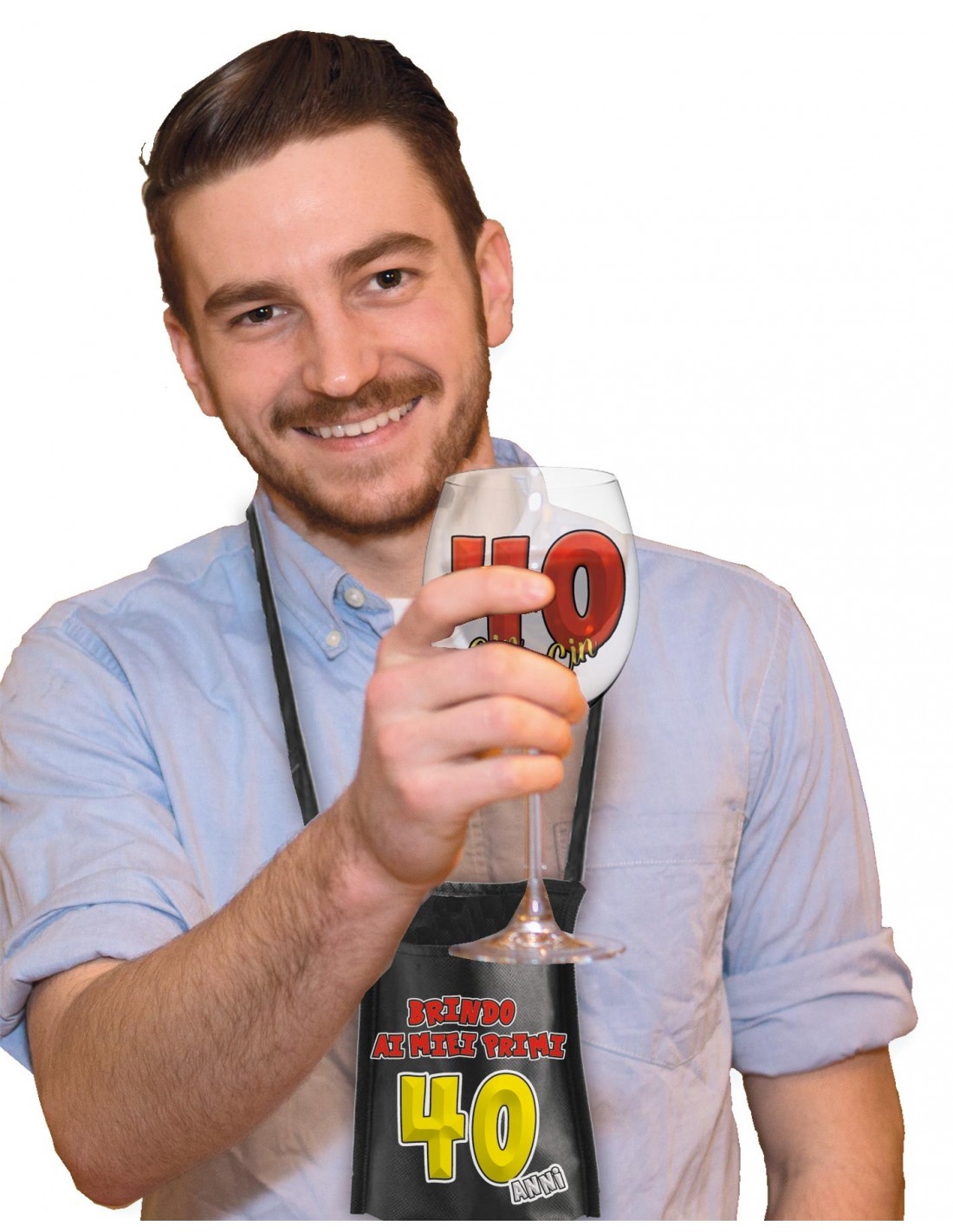 Appenditi al collo questa busta in TNT porta bicchiere stampata con la frase "Brindo ai miei primi 40 anni", che contiene il calice in vetro da 300 mi., con la scritta 40 Cin Cin, e alla base dello stelo, completa il tutto un salvagocce stampato con la scritta: E chi non beve in compagnia da questa festa può andar via.