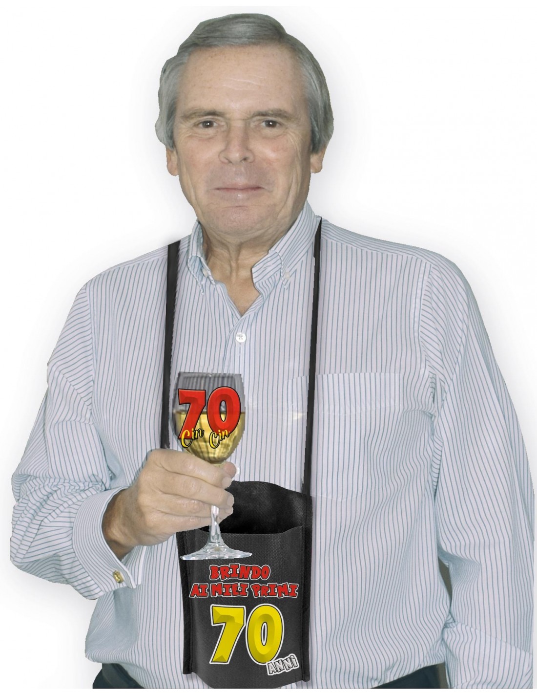 Appendi al collo del protagonista della serata questa busta in TNT porta bicchiere stampata con la frase "Brindo ai miei primi 70 anni", che contiene il calice in vetro da 300 mi., con la scritta 70 Cin Cin, completa il tutto, un divertente disco salva goccia, da inserire alla base del bicchiere.
