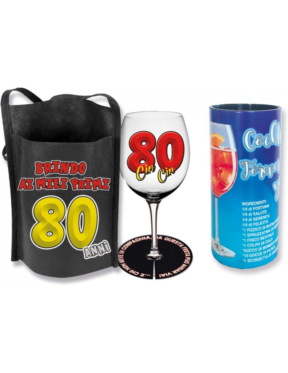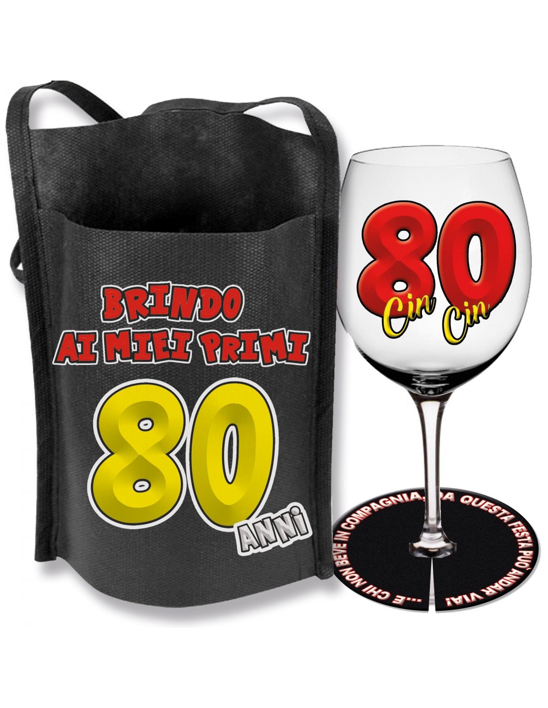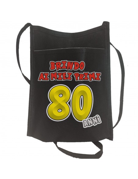 Appendi al collo del protagonista della serata questa busta in TNT porta bicchiere stampata con la frase "Brindo ai miei primi 80 anni", che contiene il calice in vetro da 300 mi., con la scritta 80 Cin Cin, e alla base dello stelo, completa il tutto un salvagocce stampato con la scritta: E chi non beve in compagnia da questa festa può andar via.