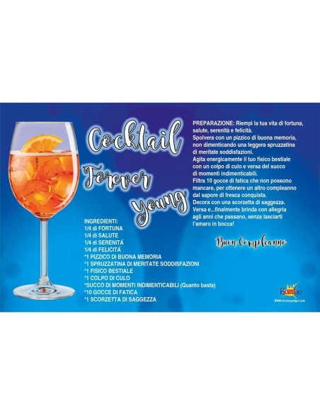 Il set e' confezionato all'interno di un cilindro di cartone con un grande adesivo colorato con la ricetta e le dosi ideali per il Cocktail Forever Young... per sempre giovane, come l'augurio che tutti vorrebbero ricevere.