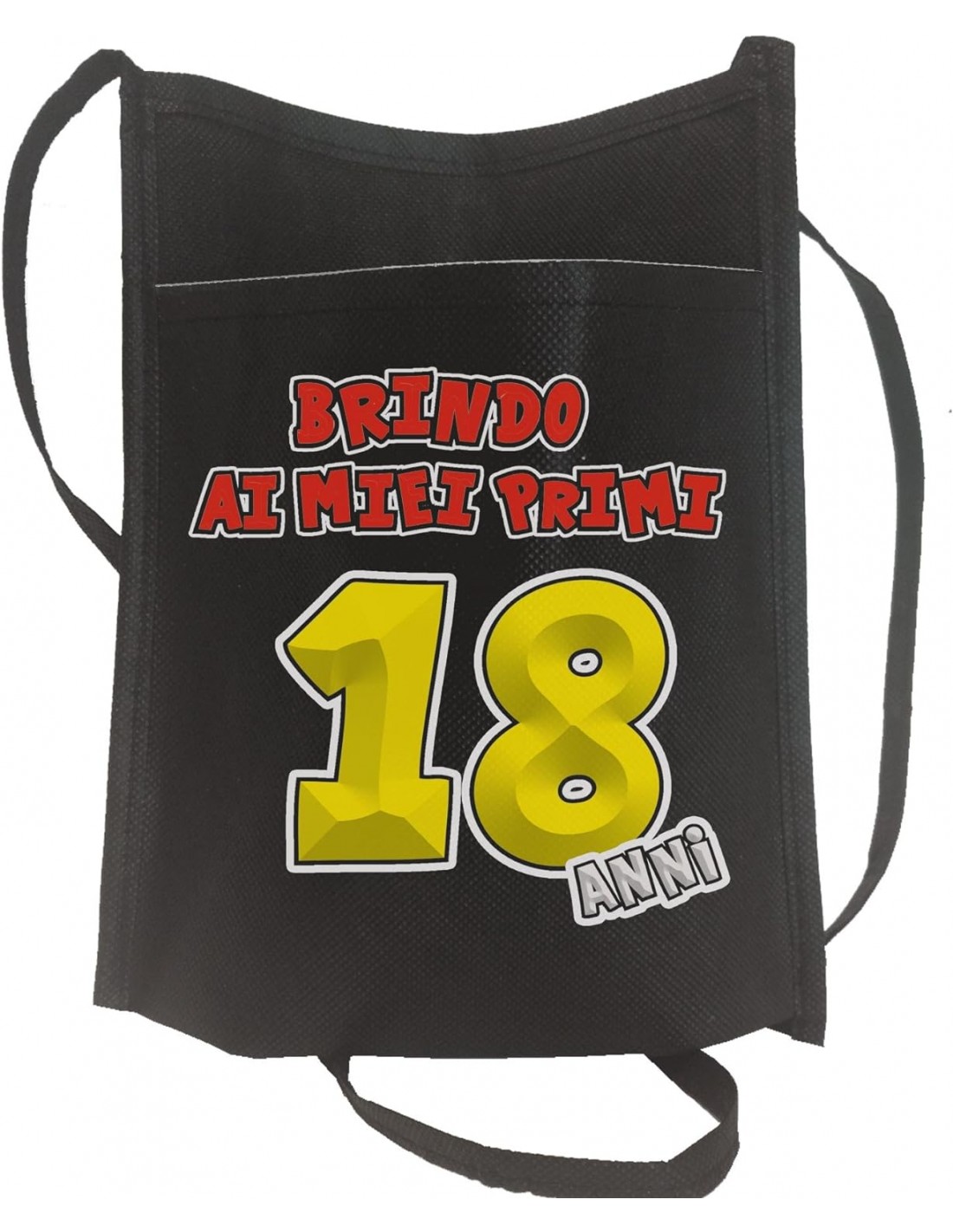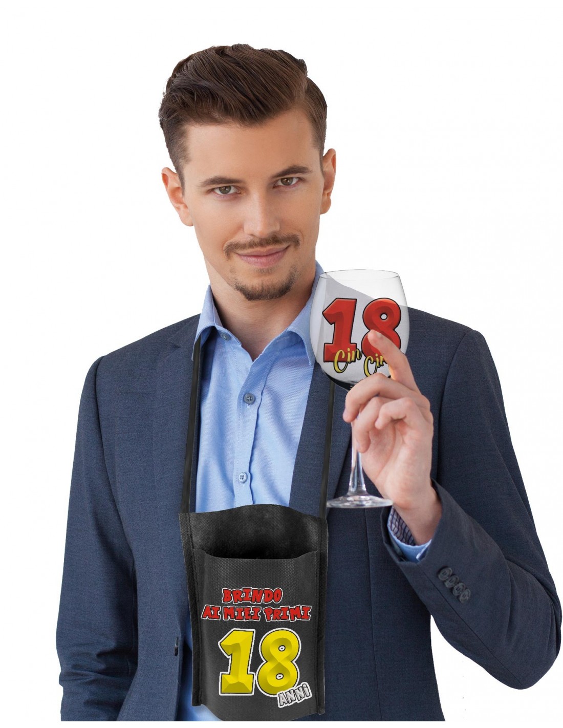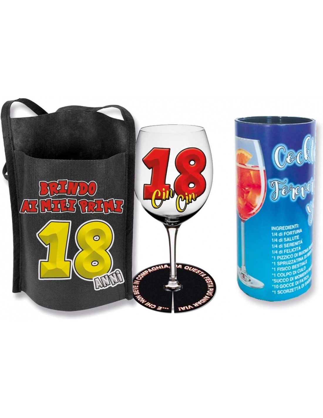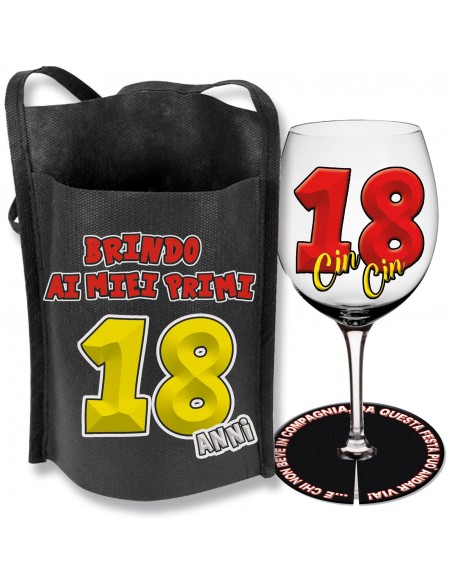 Bene, ecco il calice personale del festeggiato, dentro ad una tasca portabicchiere da appendere al collo con la scritta "Brindo ai miei primi 18 anni" e alla base del bicchiere , un disco salva goccia con la frase: e chi non beve in compagnia da questa festa può andar via.