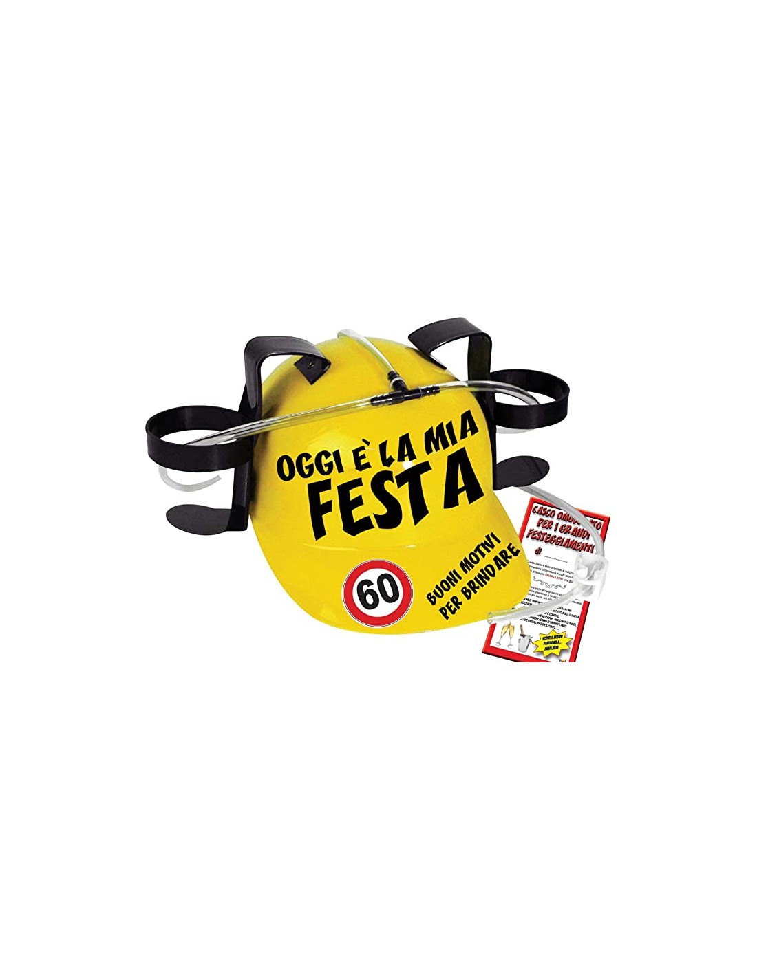 Taglia unica- Frontalmente e’ applicata una vivace scritta gialla “Oggi è la mia festa-60 motivi per brindare" mentre sul retro del casco e’ applicata l’omologazione per i festeggiamenti, inoltre l'elmetto porta lattine è arricchito da un divertente certificato.