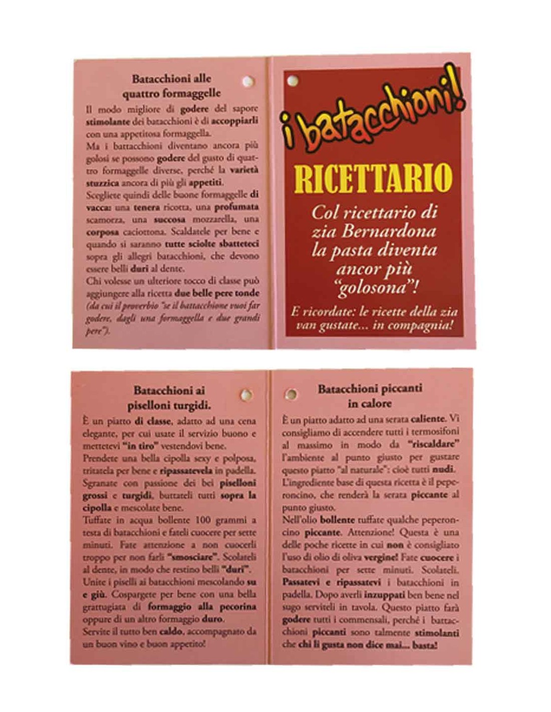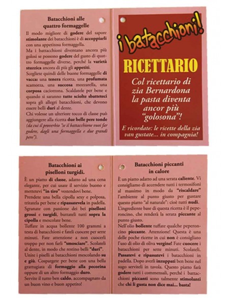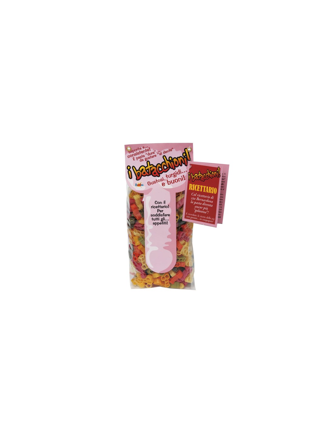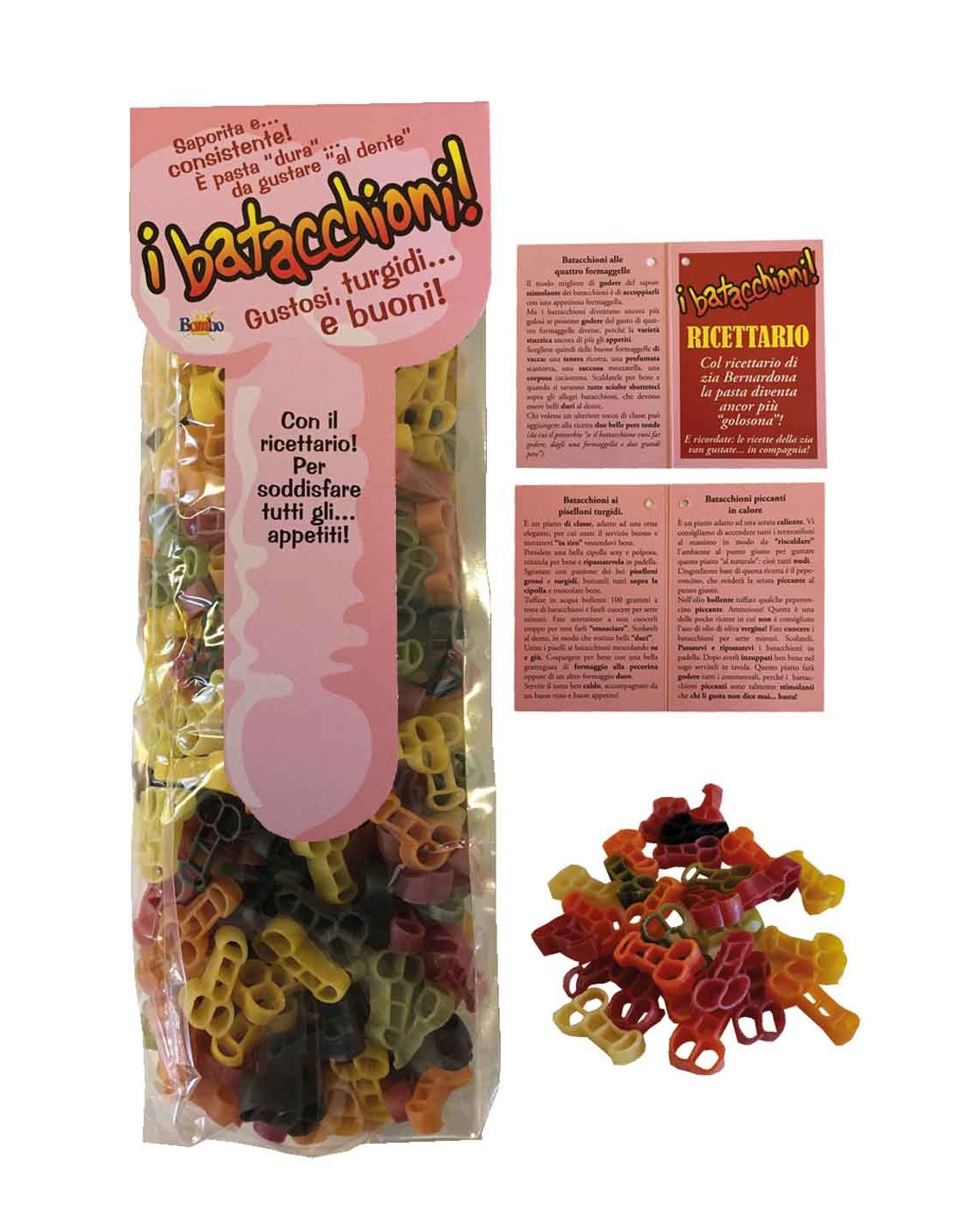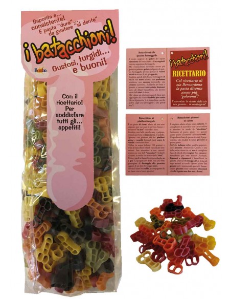 Saporita e consistente, “dura” da gustare al denteI IBatacchioni, divertente pasta di semola di grano duro, 500 gr, a forma di cazzetti a 6 colori, di circa cm.3 da crudo ma allungabile  dopo un'attenta e stimolante fase preparatoria di cottura, per pranzi goliardici tra amici o piccanti cene di coppia.