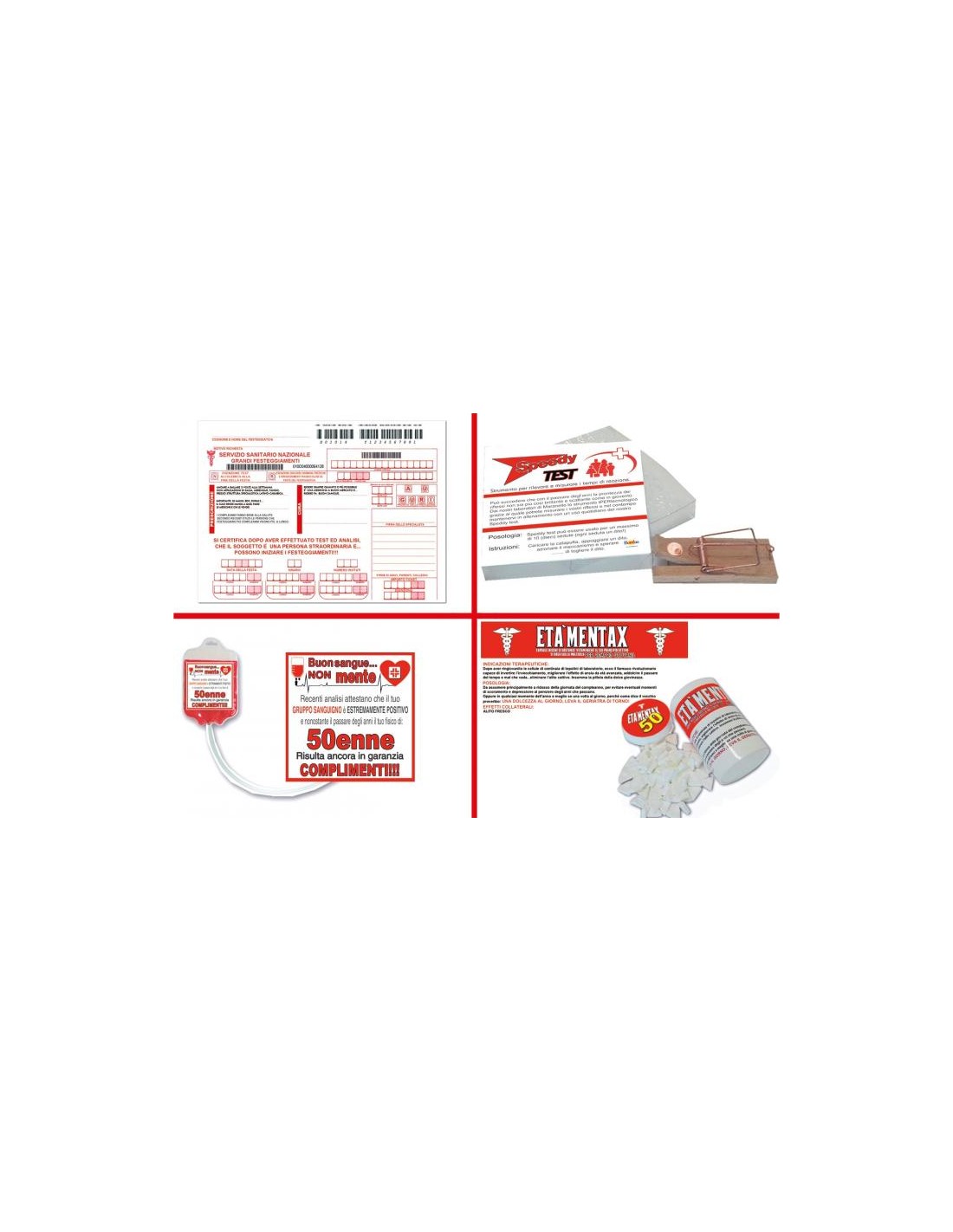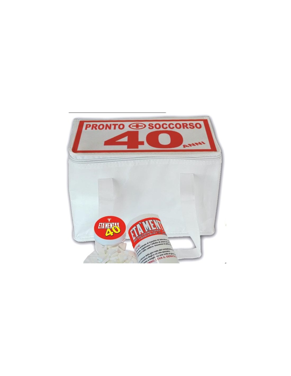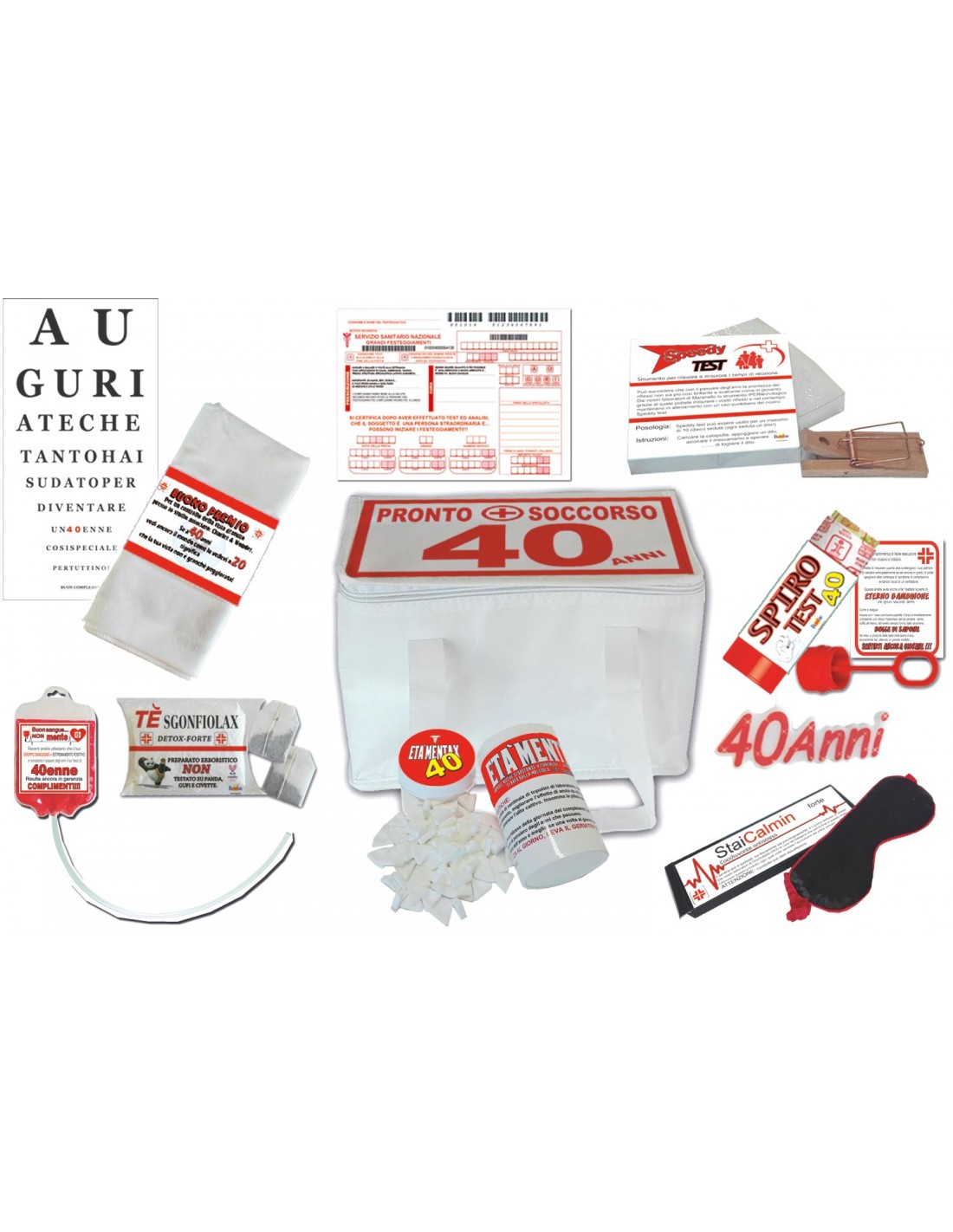 Il Pronto Soccorso 40 anni contiene 9 prodotti, una divertente e spiritosa dotazione di accessori inutili, falsi farmaci, elementi di cura e soccorso con descrizioni divertenti ed ironiche per curare eventuali malesseri che si possono presentare con l’eta’ della maturita’.