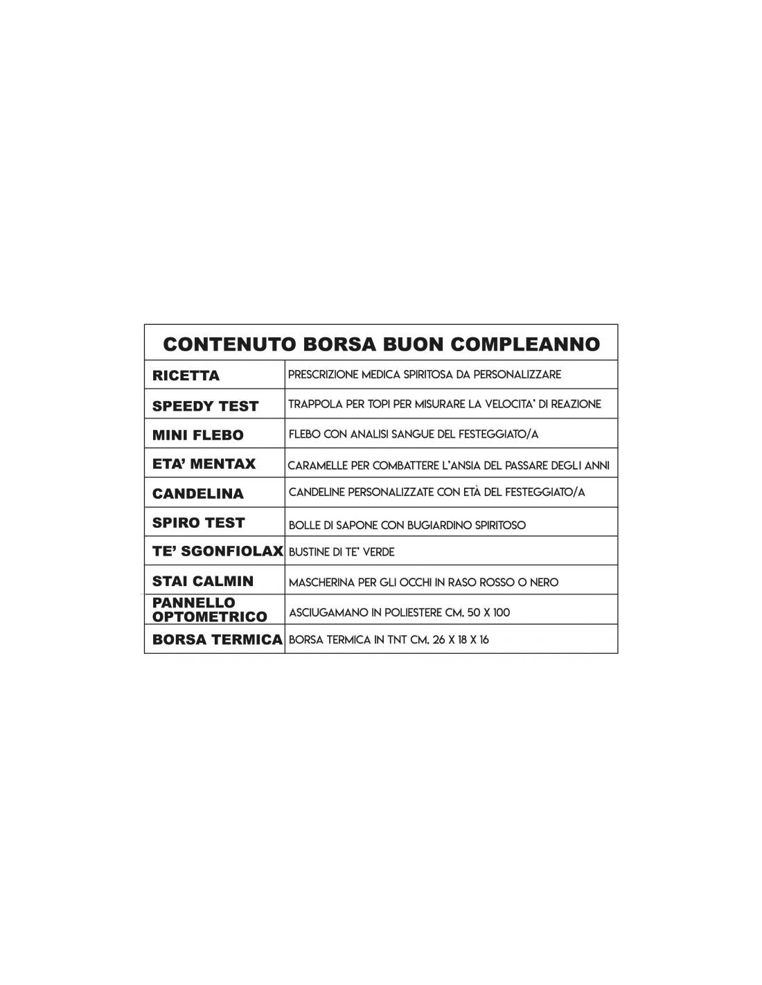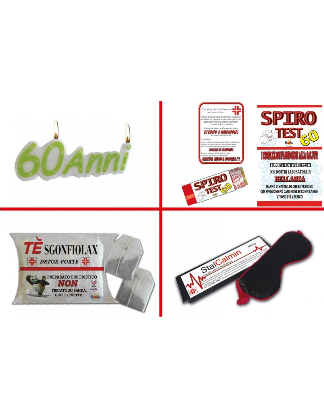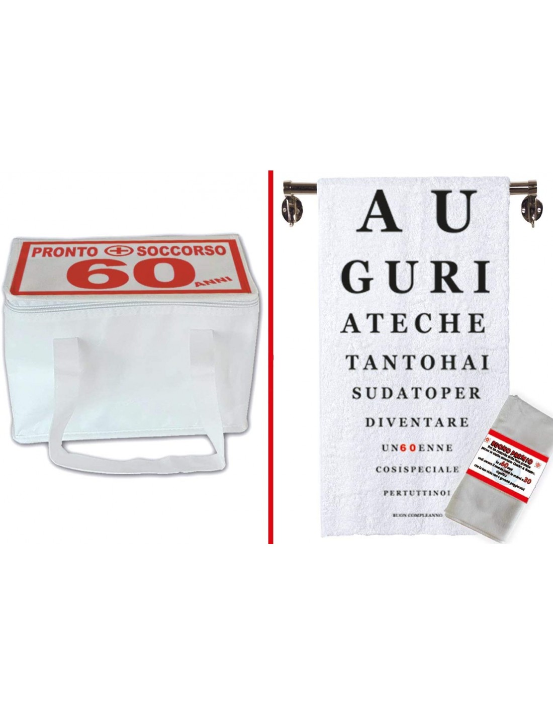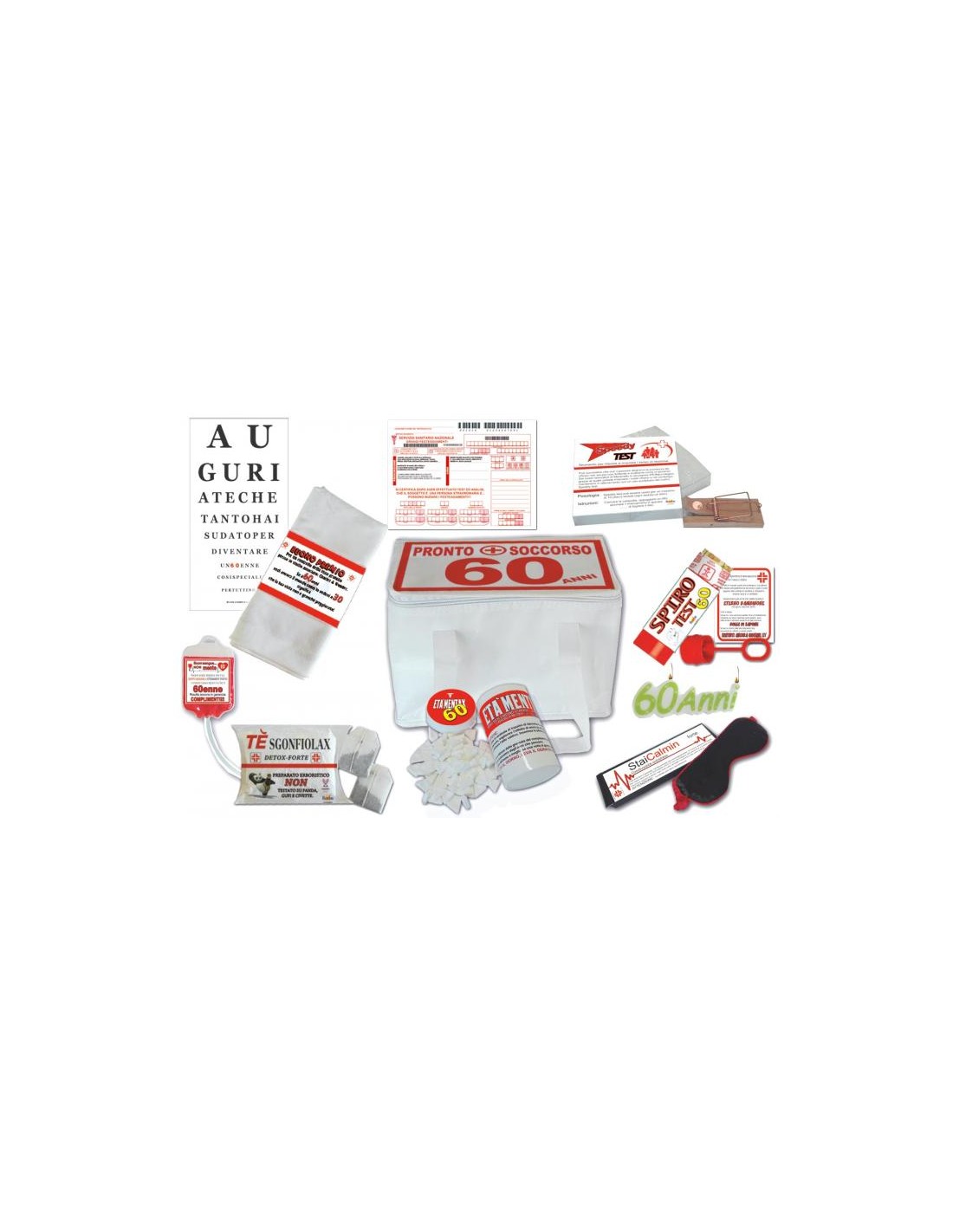 Il Pronto Soccorso 60 anni contiene 9 prodotti, una divertente e spiritosa dotazione di accessori inutili, falsi farmaci, elementi di cura e soccorso con descrizioni divertenti ed ironiche per curare gli acciacchi dovuti all’arrivo anagrafico dei 60.