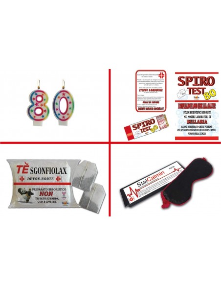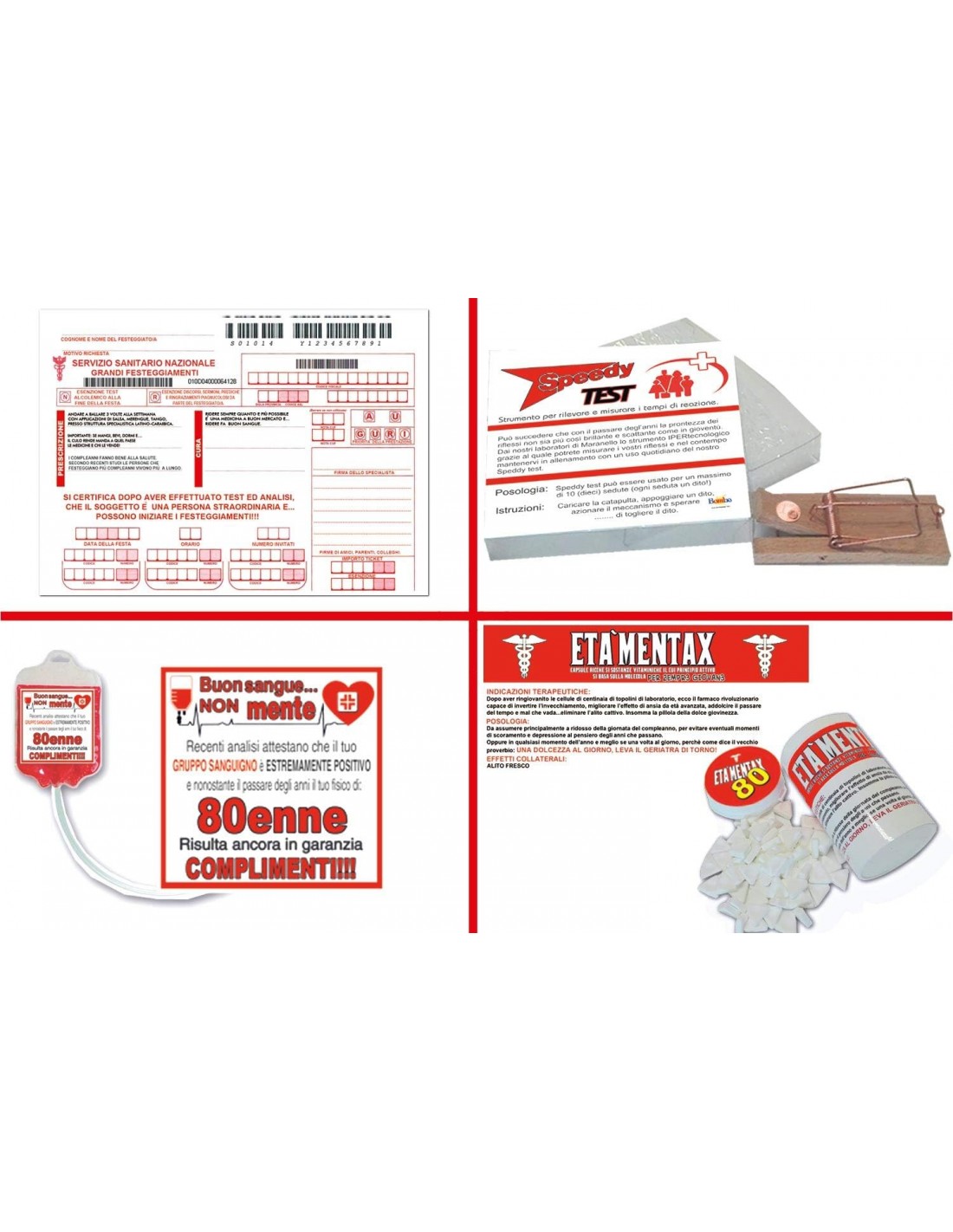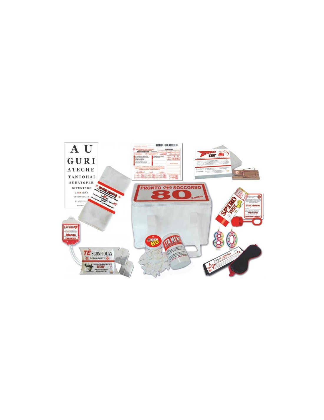 Il Pronto Soccorso 80 anni contiene 9 prodotti, una divertente e spiritosa dotazione di accessori inutili, falsi farmaci, elementi di cura e soccorso con descrizioni divertenti ed ironiche per curare eventuali malesseri dovuti alla quarta eta’