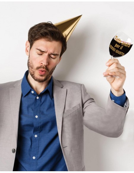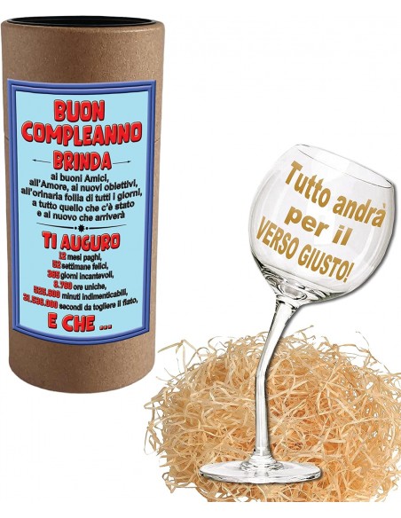 AUGURI: Il calice sbilenco e’ perfetto perche’, grazie all’aggiunta del suo messaggio augurale portafortuna, ogni brindisi anche con il peggior vino, verra’ esaltato, offrendo in dono, a chi lo avra’ ricevuto un'esperienza unica e divertente.