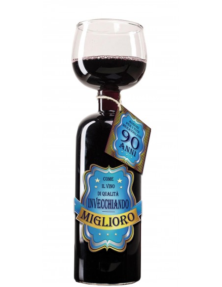 "COME IL VINO DI QUALITA’, INVECCHIANDO, MIGLIORO” e etichetta appesa allo stelo “AUGURI PER I TUOI MERAVIGLIOSI … ANNI