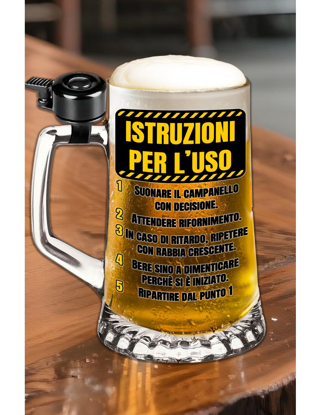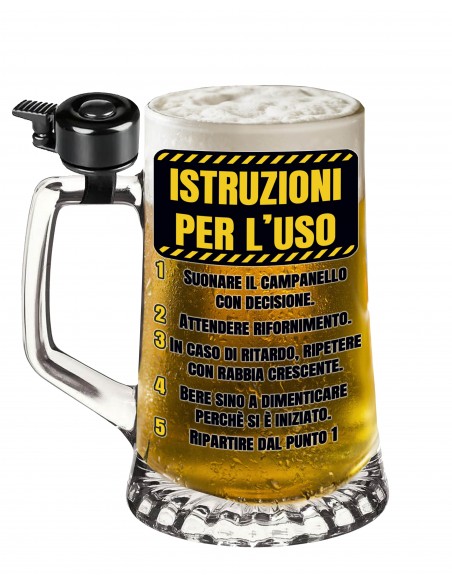 Con questo boccale in vetro da 500 ml con campanello integrato e la stampa colorata “Istruzioni per l’uso”, ogni brindisi diventa un rituale comico da seguire passo dopo passo: suonare il campanello, attendere il rifornimento, bere… e ricominciare da capo!
