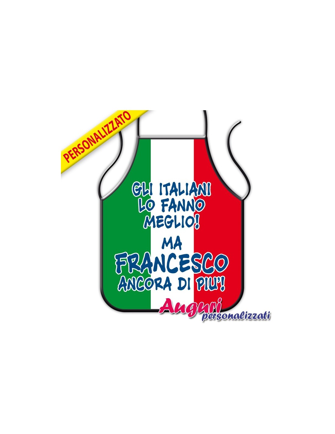 Noi proponiamo un coloratissimo grembiule tricolore con questa famosa frase personalizzabile con il nome di chi lo indossera’