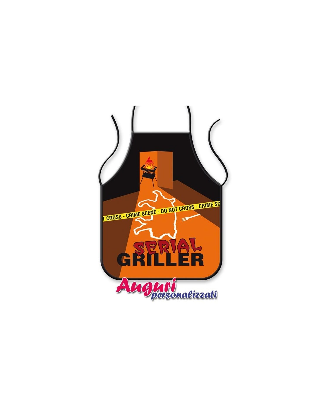 Il prodotto è un indispensabile accessorio per la cucina, soprattutto per chi si diverte a cuocere la carne al barbecue. Di grandi dimensioni, il grembiulone misura cm. 65x80. Sul fronte, la grafica evidente stampata con il giallo tipico dei noir evoca storie di delitti e di fantomatici serial killer. In questo caso, però, si tratta di un ... serial griller, un autentico maestro delle grigliate che sarà senz'altro capace di prendervi per la gola. Risate assicurate e fantastiche grigliate per tutti!