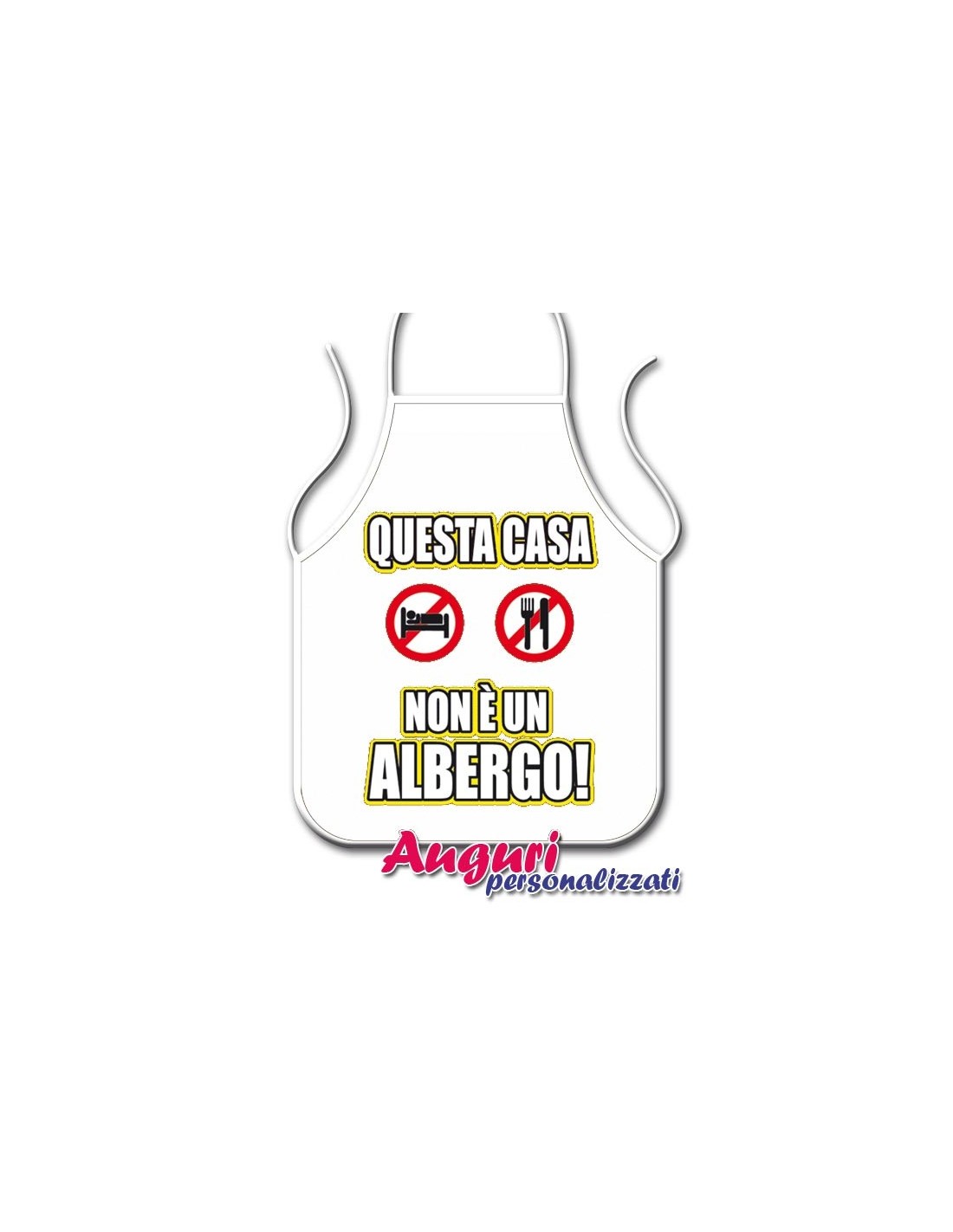 Questa casa non è un albergo! Probabilmente una delle frasi più celebri e pronunciate da chiunque almeno una volta, in casa propria, magari rivolti a un figlio un po' riottoso. Da oggi questa massima potrà essere degnamente celebrata grazie a questo allegro grembiule da cucina della famiglia indispettita, che riporta fedelmente tale avvertimento accompagnato da altrettanto eloquenti segnali visivi.
