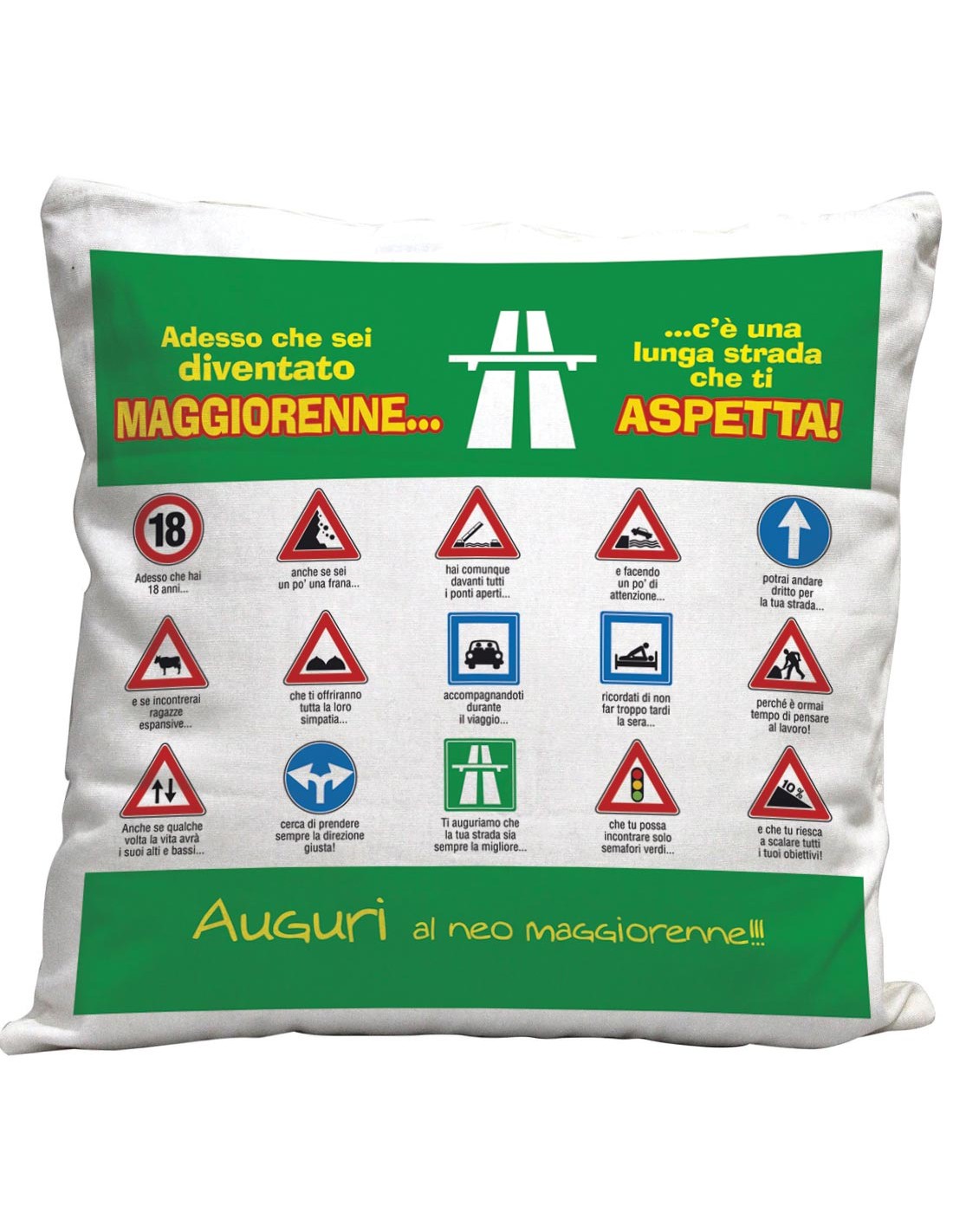 Il cuscino per i 18 anni è di colore bianco nella parte stampata e nero sul retro. E' realizzato in poliestere/cotone nella dimensione di 40x40 centimetri. Le divertenti immagini con i divieti e i pericoli da affrontare una volta raggiunta la maggiore età, sono preceduti dalle simpatiche parole “adesso che sei diventato maggiorenne… c'è una lunga strada che ti aspetta”. Nella parte bassa del cuscino invece ci sono le parole di "auguri al neo maggiorenne": l'omaggio giusto per la giornata speciale di un amico.