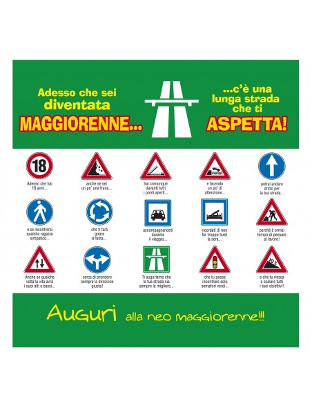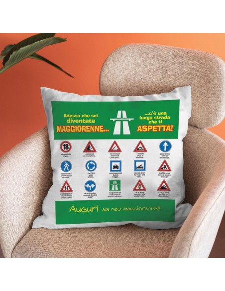 Maggiore età in vista? Scegli un cuscino con segnali stradali per i 18 anni della tua amica: un design estremamente divertente per festeggiare questo giorno speciale. Ora che i fatidici 18 stanno per arrivare, la vita subisce letteralmente una svolta! E qual è il modo migliore per prepararsi ad affrontarla, se non tenendo a mente le regole della strada? Questo gadget con i segnali stradali rappresenta davvero bene quello che sarà il nuovo, vicino ed esaltante futuro. Patente in arrivo compresa!