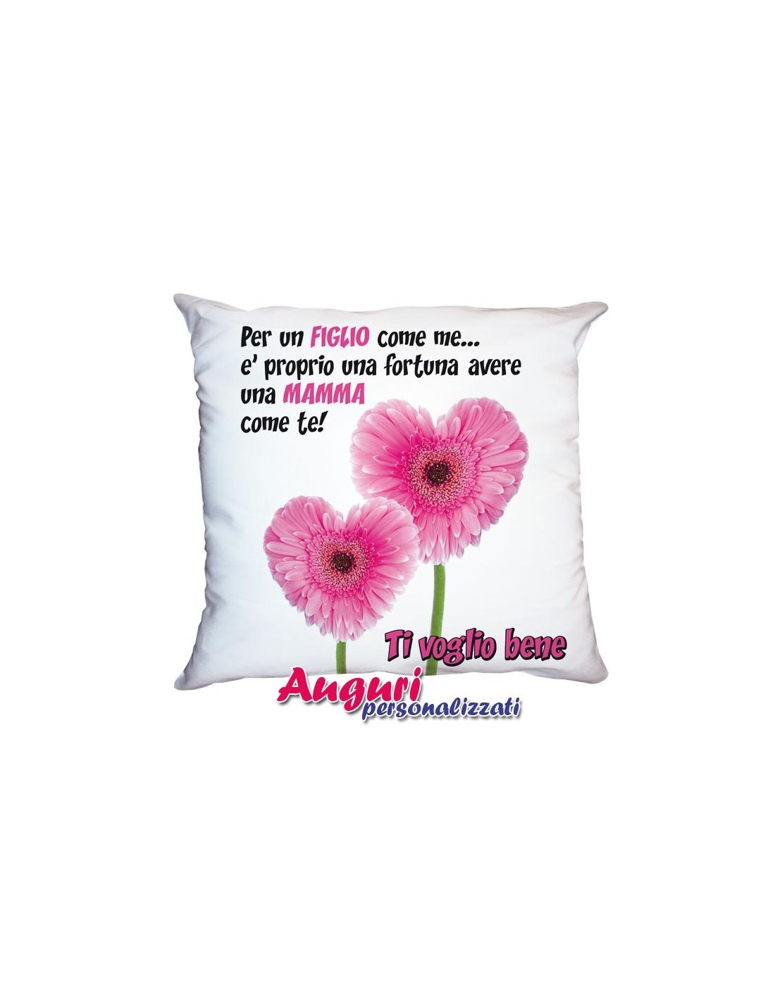 Due colorati fiori rosa a forma di cuore a simboleggiare Madre e figlio stampati su un cuscino morbido da abbracciare e guardare,una frase da leggere e rileggere che rendera' Mamma orgogliosa di avere un figlio cosi' fortunato.