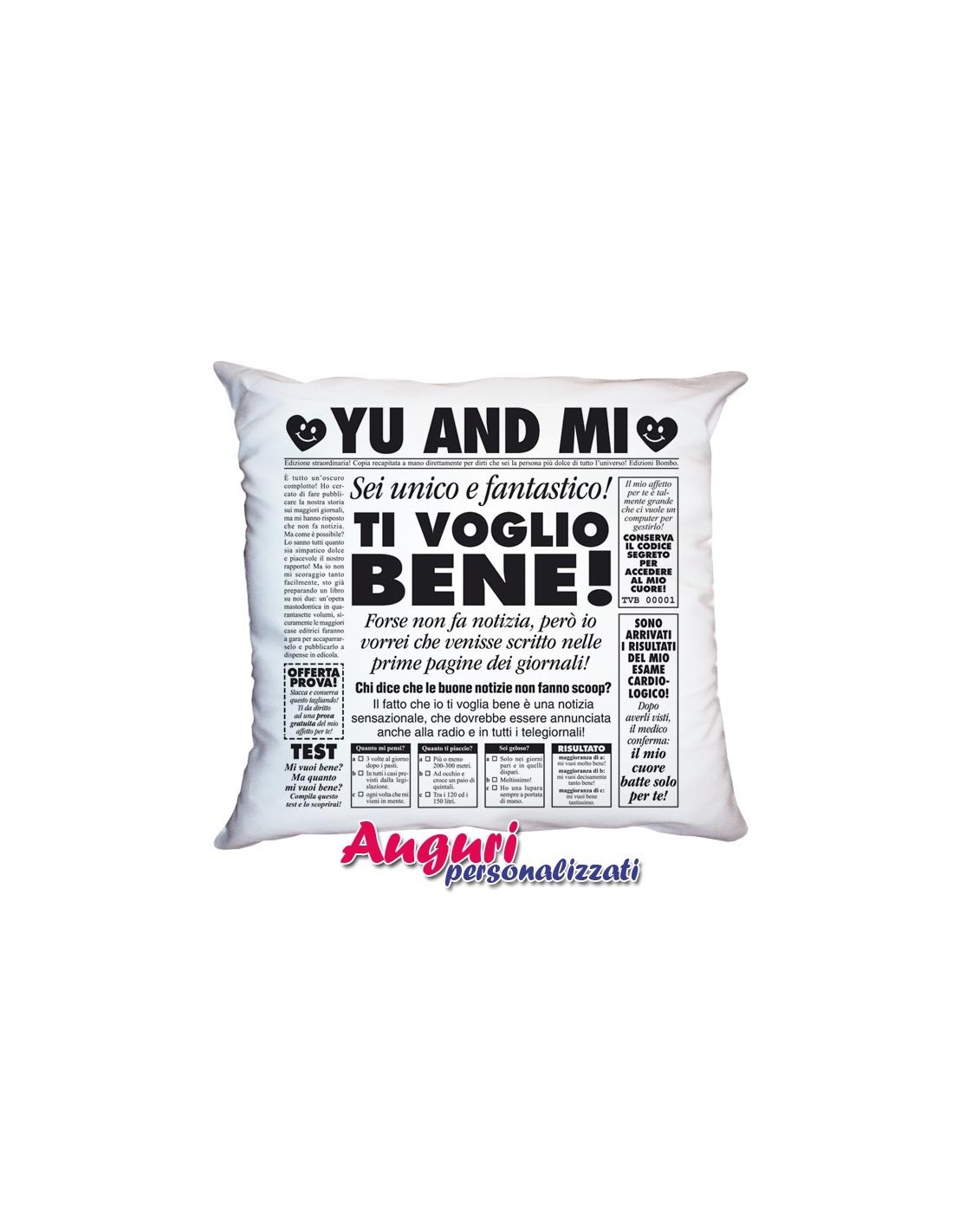 Come fa intuire il nome, il lato principale ricorda la prima pagina di un quotidiano. Un giornale molto speciale che dimostra il tuo amore: notizie divertenti, test, gossip e scoop scherzosi, che rendono protagonista il tuo lui! Tante piccole indiscrezioni che rivelano quanto unico e fantastico è per te. Un cuscino a quotidiano per dirgli ti voglio bene in maniera originale e divertente.