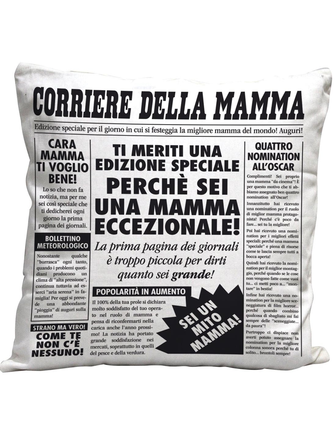 Il cuscino a giornale per la mamma è un gadget perfetto per rendere spiritoso e divertente un festeggiamento speciale: che sia la sua festa, il suo compleanno o Natale, questo articolo trasmette sempre affetto e tanta simpatia. Le varie frasi spassose riportate come fossero i titoli presenti in un quotidiano, fanno sì che l'intero cuscino assuma un'aria ironica e gioiosa.