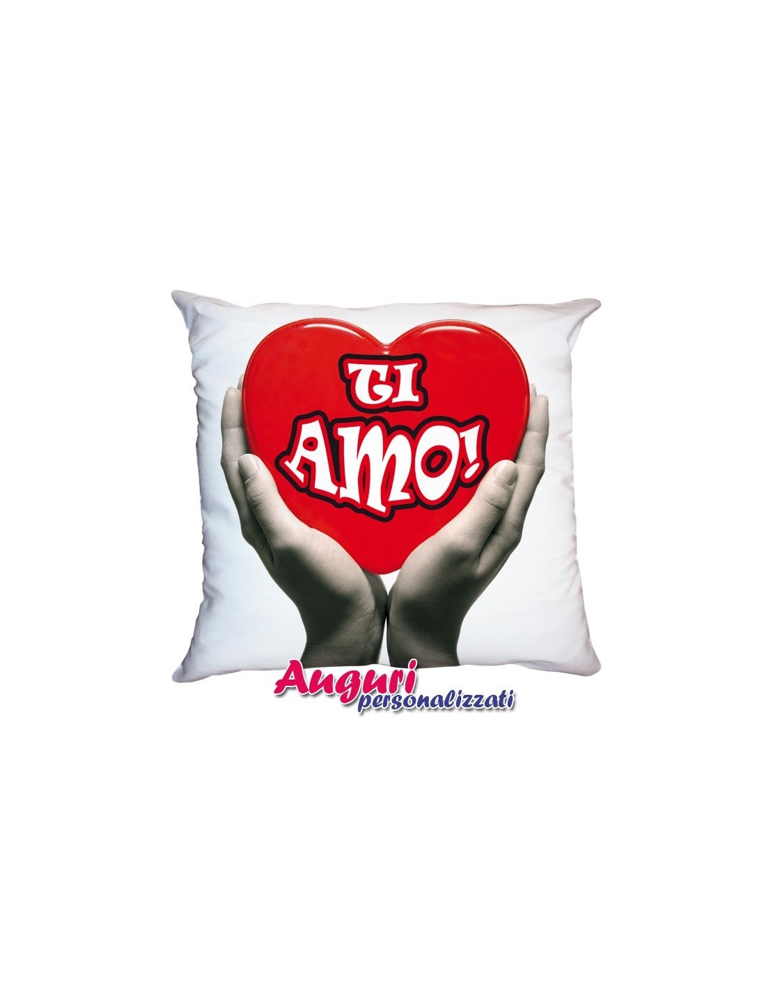 Per una ricorrenza particolare, un anniversario, una data importante che contenga un ricordo speciale, finanche un giorno comune che si vuole impreziosire: questo cuscino con la scritta Ti amo e il disegno di un cuore tra le mani è adatto a qualunque occasione. Le sue dimensioni sono 40 cm x 40 cm, ed è interamente sfoderabile. La disarmante dolcezza della scritta e del disegno, fanno di questo cuscino un oggetto adatto per essere regalato da solo, ma anche in abbinamento a qualsiasi altro dono, per arricchirne ulteriormente il significato.