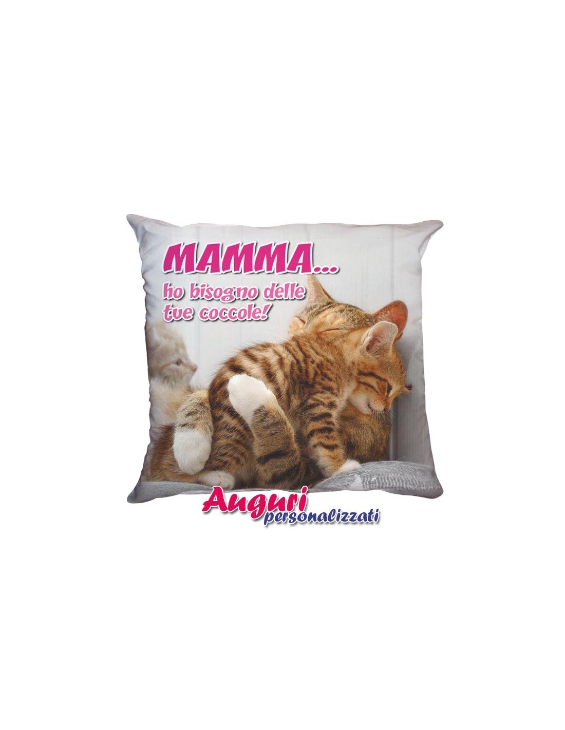 Il tenerissimo cuscino per la mamma con scritto ho bisogno delle tue coccole è il regalo perfetto se gli abbracci di tua madre sono l'unica cosa capace di raddrizzare una giornata storta o di consolarti dopo qualche delusione. La dolce immagine di due micini abbracciati dall'aria serena e in pace si unisce alla splendida frase presente: anche se ormai sei grande, non è mai troppo tardi per scambiarti tenerezze con la tua insostituibile mamma. Per una festa o un giorno speciale, questo è il regalo perfetto.