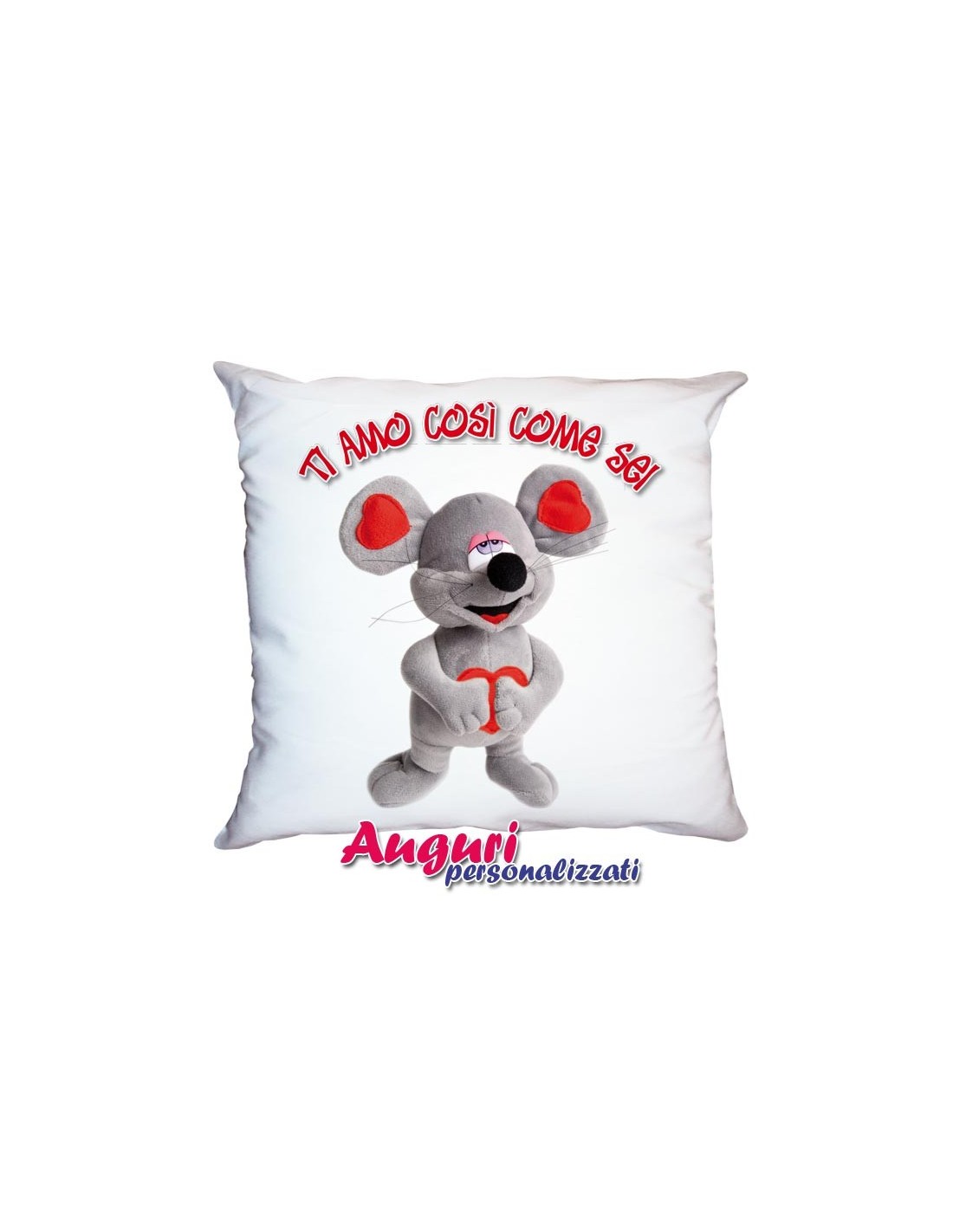 Il cuscino con il topino innamorato e la scritta “Ti amo così come sei” è perfetto come dolce pensiero.