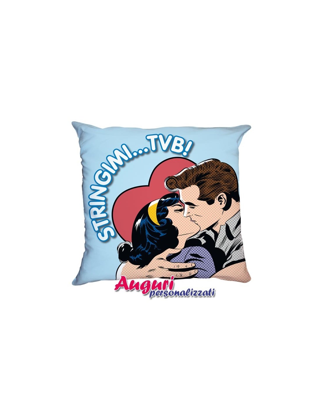 Parliamo di un prodotto sfoderabile di forma quadrata, che misura 40x40 cm. Sul davanti reca un disegno in stile poster con un bacio romantico sotto a un cielo limpido, un cuore rosso e la scritta: Stringimi...tvb! Un invito che il partner accoglierà subito, con un abbraccio stretto stretto e tante paroline dolci!