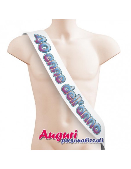 La fascia da concorso per il 40enne dell'anno è realizzata in morbido raso bianco ed è lunga 225 cm per 12 cm di altezza. La scritta, che si presta a celebrare con successo sia compleanni di maschi che di femmine, è formata da grandi lettere colorate e dal carattere simpatico. Questa fascia premio, che può sostituire degnamente il classico biglietto di auguri, è personalizzabile con scritte simpatiche ed autografi per diventare un ricordo indimenticabile di una giornata unica e speciale.
