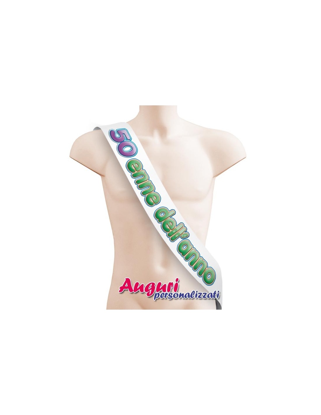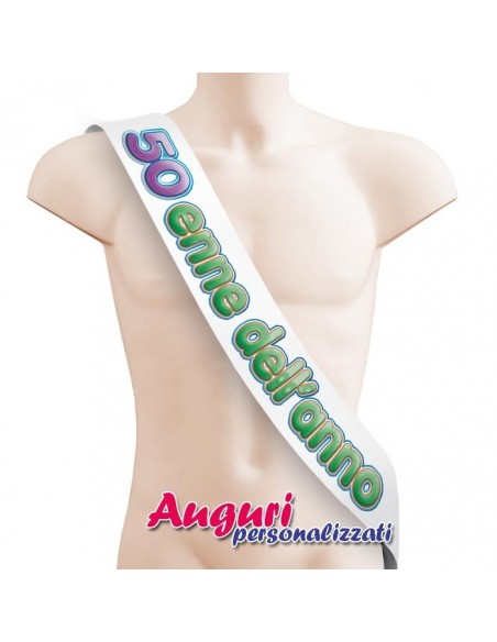 La fascia da concorso per il 50enne dell'anno è realizzata interamente in un materiale esteticamente perfetto come il raso, lucido e lavabile. La scritta scherzosa in stampatello, richiama alla mente i concorsi a premi, rendendo l'idea dell'importanza della persona che la riceve. Il gadget, oltre a includere la scritta "50enne dell’anno", permette di aggiungere con un pennarello le firme e le dediche degli amici. La persona che la riceve non potrà fare a meno di conservare questo oggetto come ricordo della splendida serata trascorsa insieme.