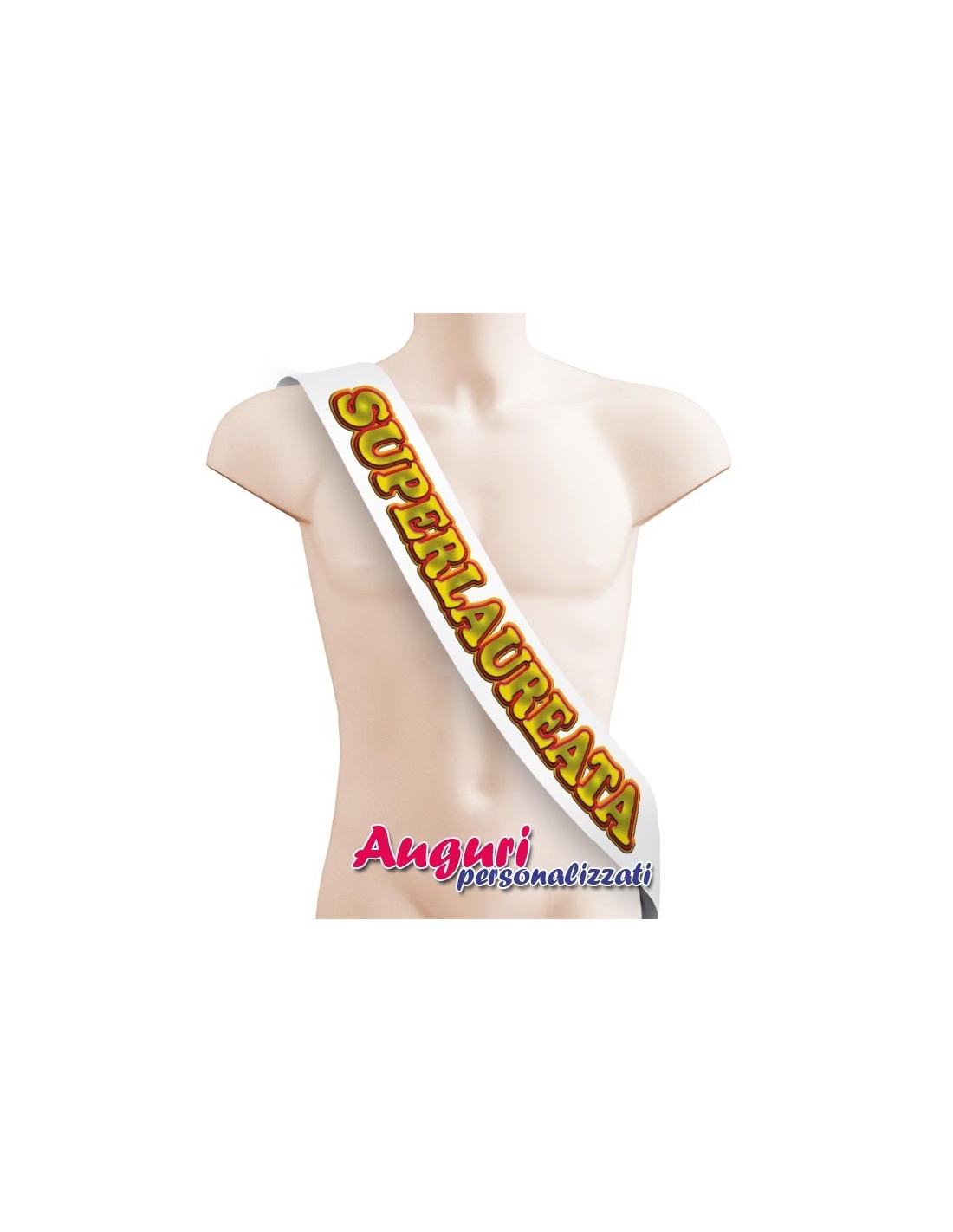La fascia per premiazione super laureata è realizzata in tessuto di raso bianco e la sue misure equivalgono a 225x12 centimetri. È un articolo da regalo destinato prettamente a un pubblico femminile. I colori della fascia visibili nell'immagine presente su sito potrebbero variare leggeremente, questo è dovuto alle regolazione dei colori dei vari tablet e smartphone. La grafica e le scritte sono atte per rendere il regalo unico e divertente. Non disponibile in altre misure.
