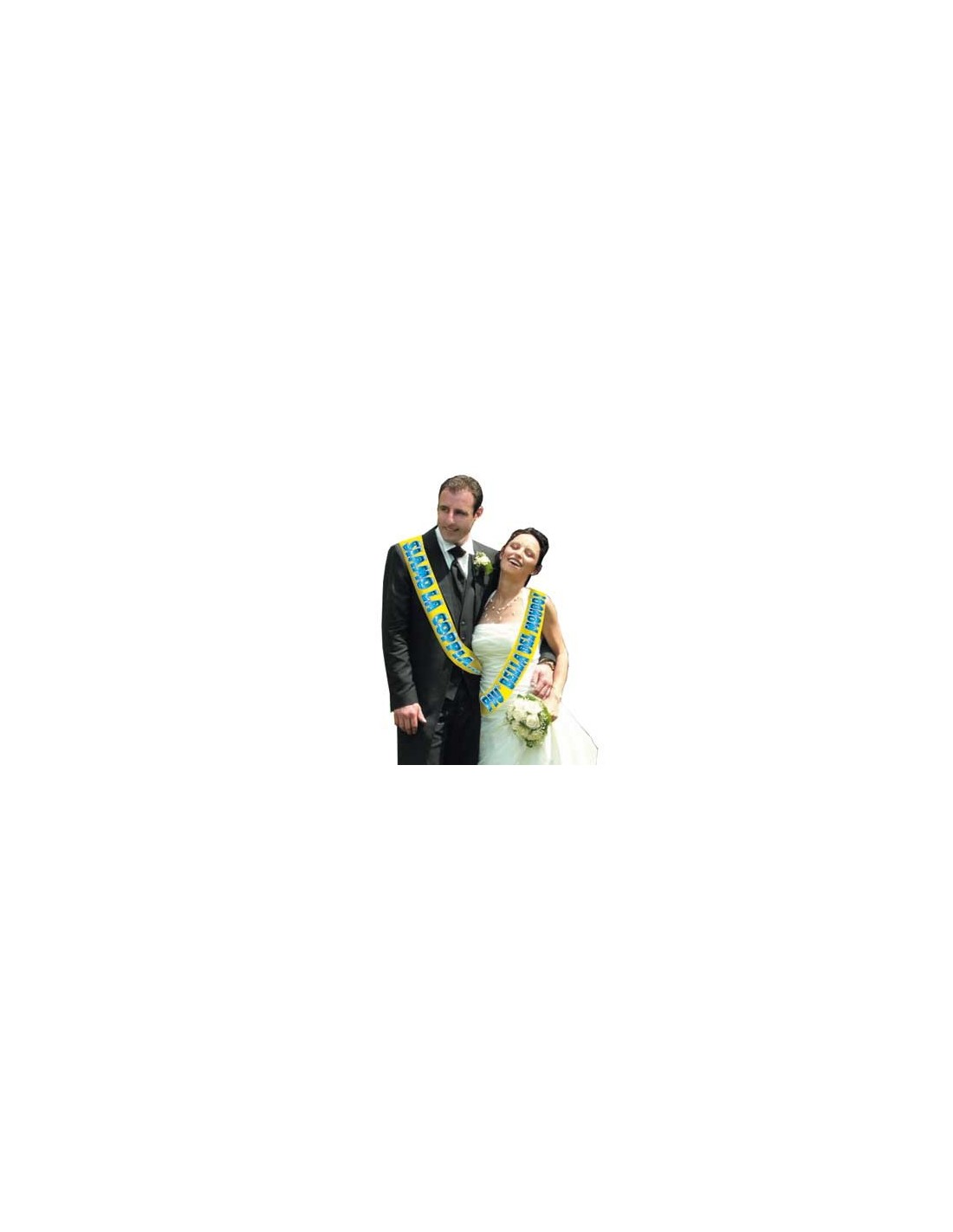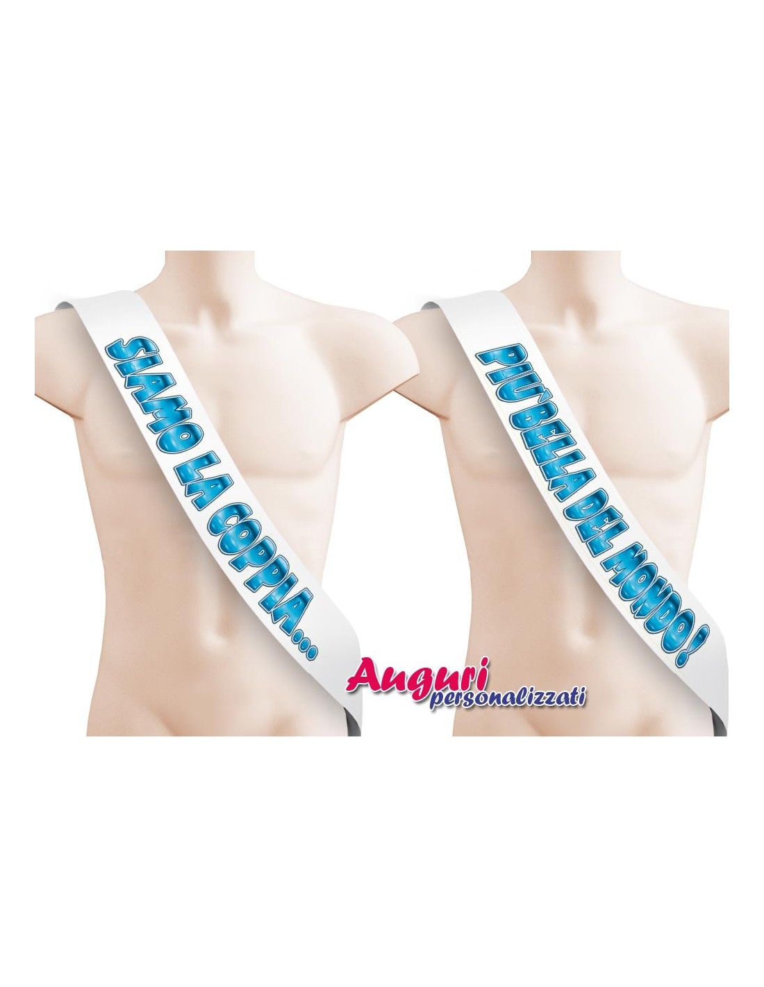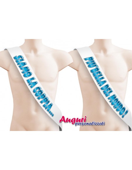 Queste fasce per la coppia fanno parte della ricchissima serie di fasce celebrative per tutte le categorie. Realizzate in tessuto di raso chiaro per far risaltare meglio le grandi scritte, misurano circa cm. 225 X 12 e risultano così molto facili e comode da indossare a tracolla, proprio come le vere fasce premio.