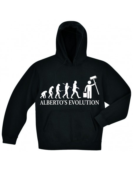 La felpa è nera con cappuccio. Al centro vi è la scritta "Evolution" che può essere posta al fianco del tuo nome, rendendo l'indumento personalizzato. Il tutto si trova sotto ad un divertente disegno rappresentante l'evoluzione della specie umana, la quale, invece che con l'uomo, si conclude con un imbianchino avente in mano un secchio e un pennello. Per completare l'opera vi è poi una comoda tasca a canguro.