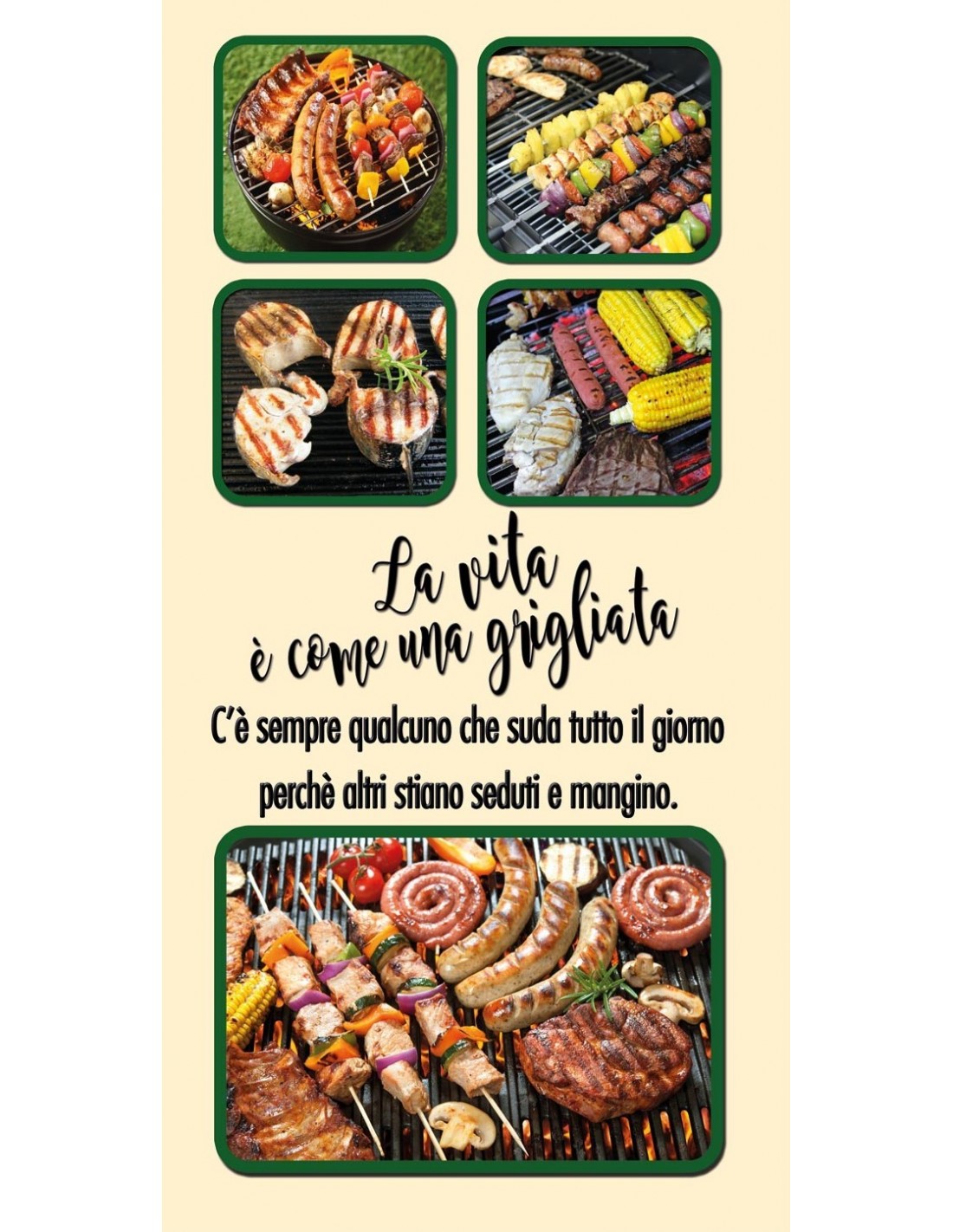 Un canovaccio con stampe "grigliere", perfetto per asciugare il sudore dopo tre ore di cottura indiretta sotto il sole, mentre tutti chiedono: "Ma è pronta?"