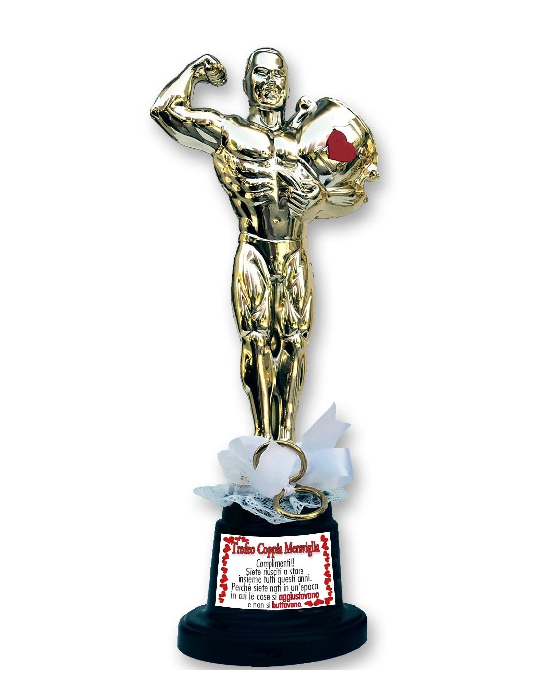 Un trofeo di cm.29 con adesivi per la personalizzazione in omaggio dedicati a Matrimoni, Anniversari e Coppie di nome e di …fatto che festeggiano ancora con entusiasmo, anni di vita insieme.