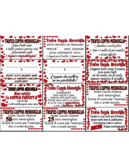 La confezione comprende tutti gli adesivi dell’immagine di presentazione, per darvi la possibilita’ di personalizzare il trofeo rendendolo unico e piu’ giusto alla coppia che lo dovra’ ricevere