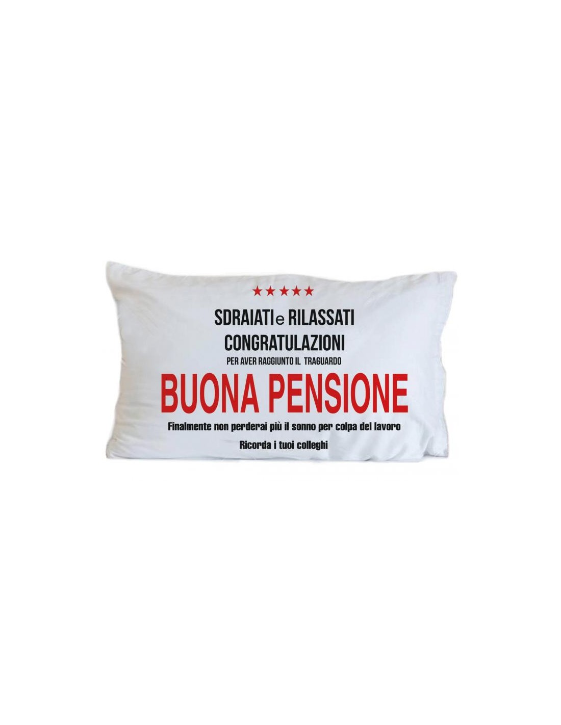 Finalmente un/una tua amica o collega e' arrivato al traguardo della PENSIONE? Ecco il suo guanciale personale con federa augurale stampata con le congratulazioni di tutti coloro che lo hanno sopportato e supportato nel suo periodo di lavoro. Un regalo che rimarra' nella memoria del neo pensionato e che sicuramente usera' nel tempo.