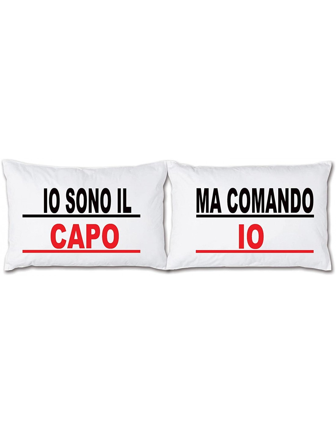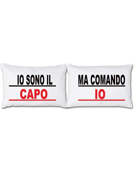 Per determinare chiaramente chi comanda a letto e non solo, ecco la nostra coppia di federe per il vostro lettone matrimoniale con messaggio diviso in due parti: Io sono il Capo....Ma comando Io