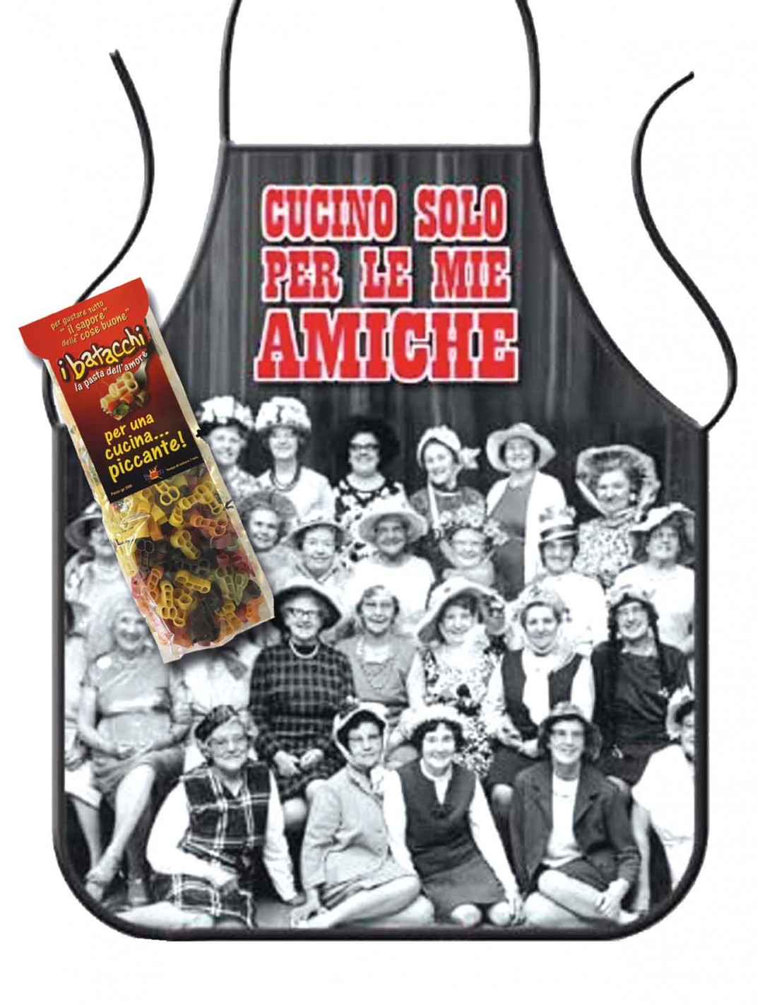 Per il successo di una serata, di una cena o di un party tra amiche e sei un po’ a corto di idee, ecco un kit da cucina veramente divertente ed ironico: il nostro grembiule da cucina dedicato all’amicizia tra donne ed un pacco da 500 gr. di pasta di semola di grano duro a forma di piccolo pene, pisello, cazzetto, minchietta, pistolino, bischerello in 6 colori, per un piccante primo piatto con aglio, olio e peperoncino.
