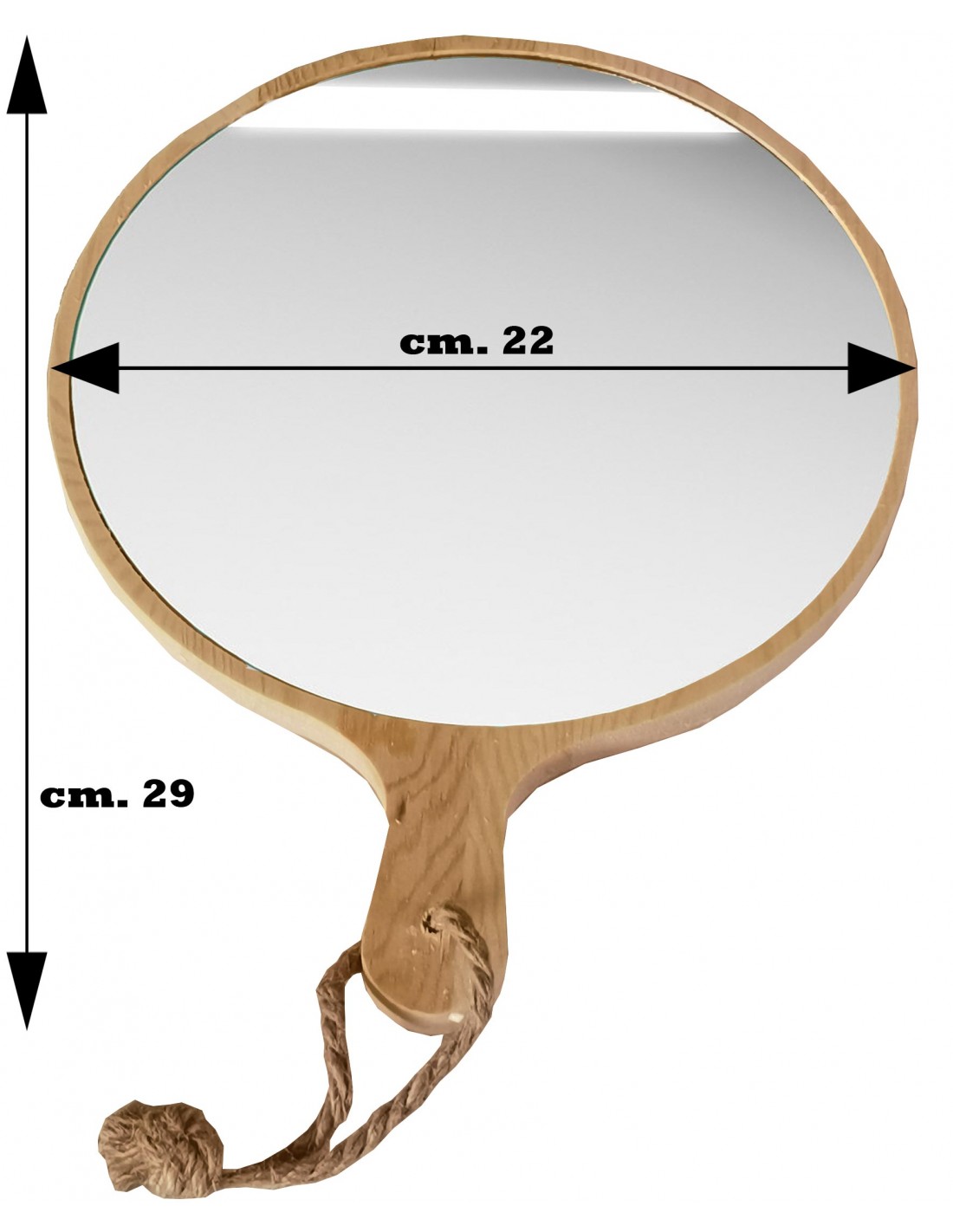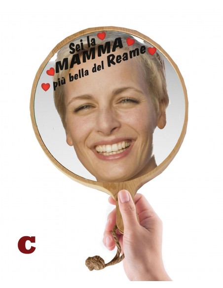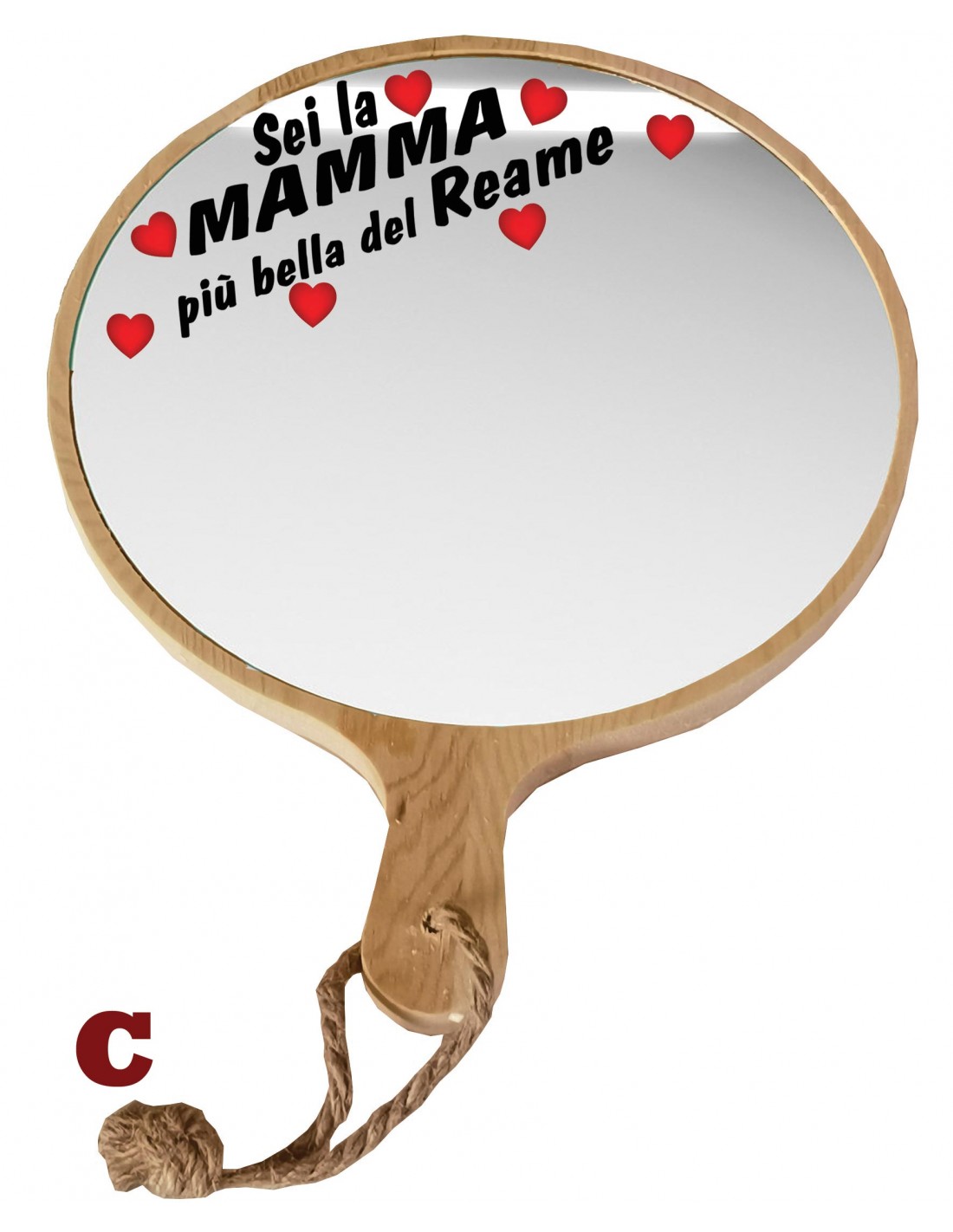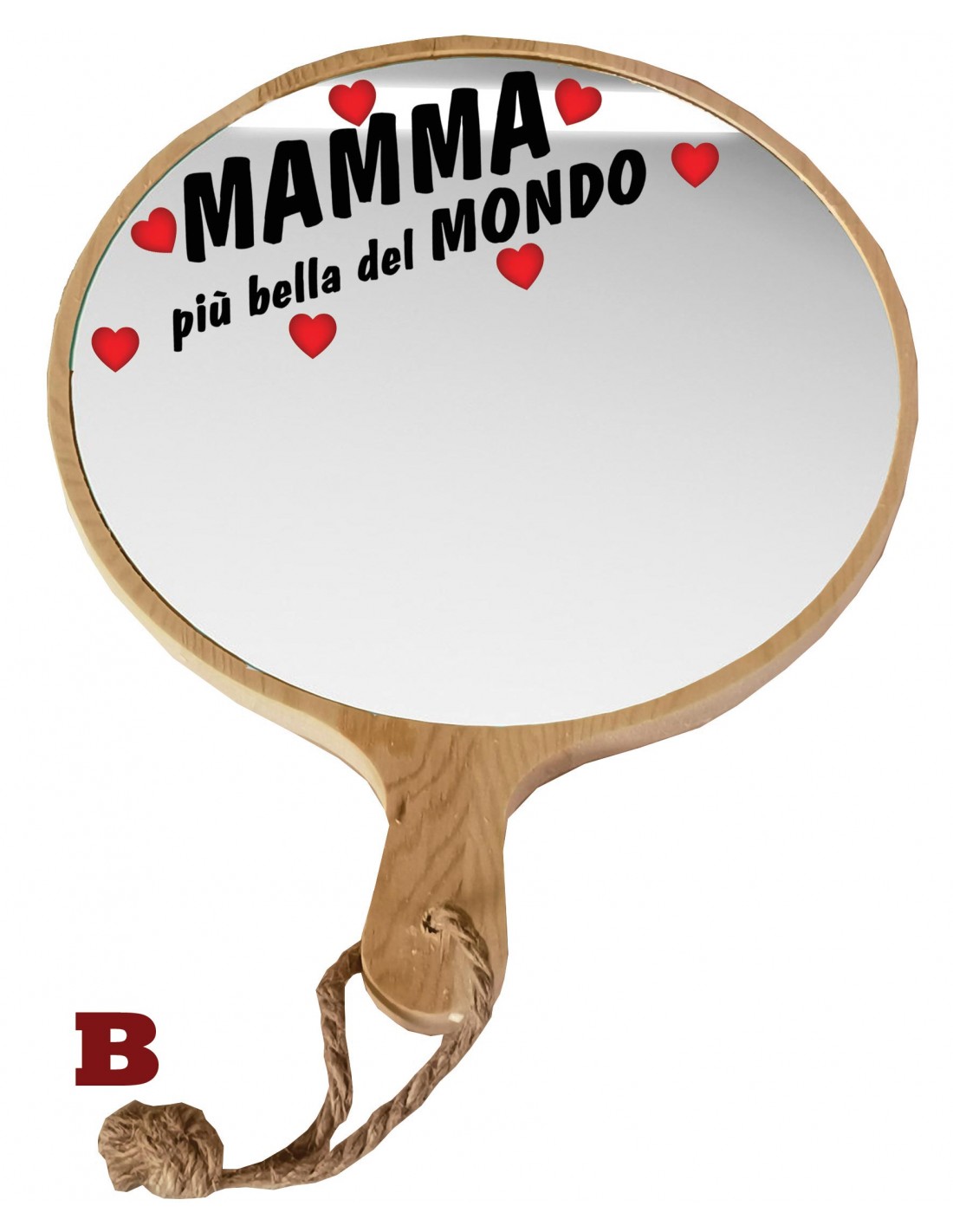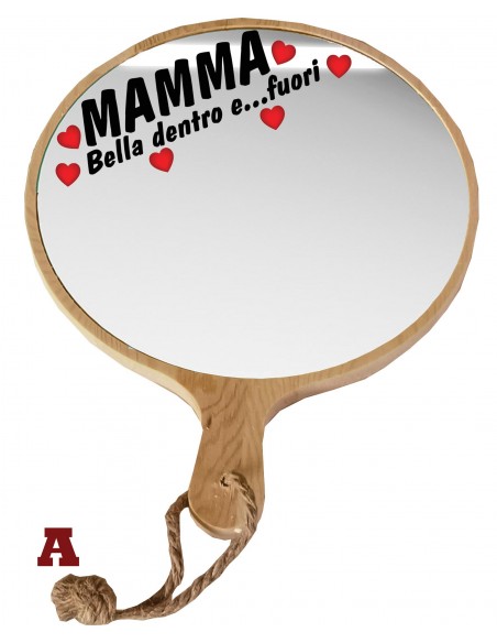 Specchio tondo con impugnatura in legno di pino con applicata una frase che esalta le fantastiche qualita' estetiche della tua Mamma. Dimensioni cm. 22 X 29.