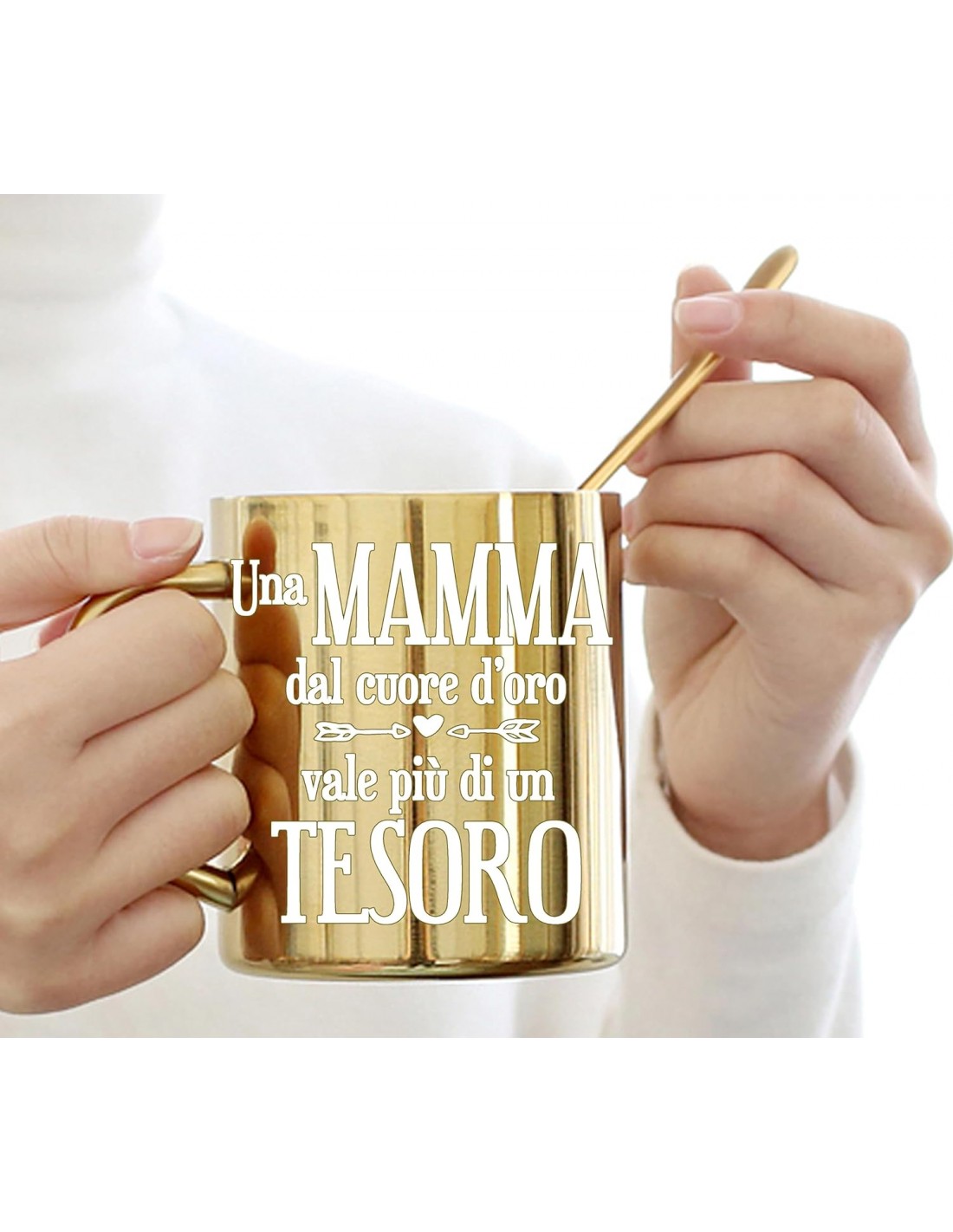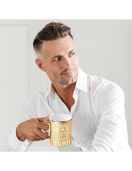 Una tazza è sempre utile e il genitore che la riceverà apprezzerà messaggio amorevole e divertente mentre la metallizzazione oro conferisce un tocco di eleganza e preziosità che la renderà agli occhi di Papà e Mamma… un regalo straordinario.