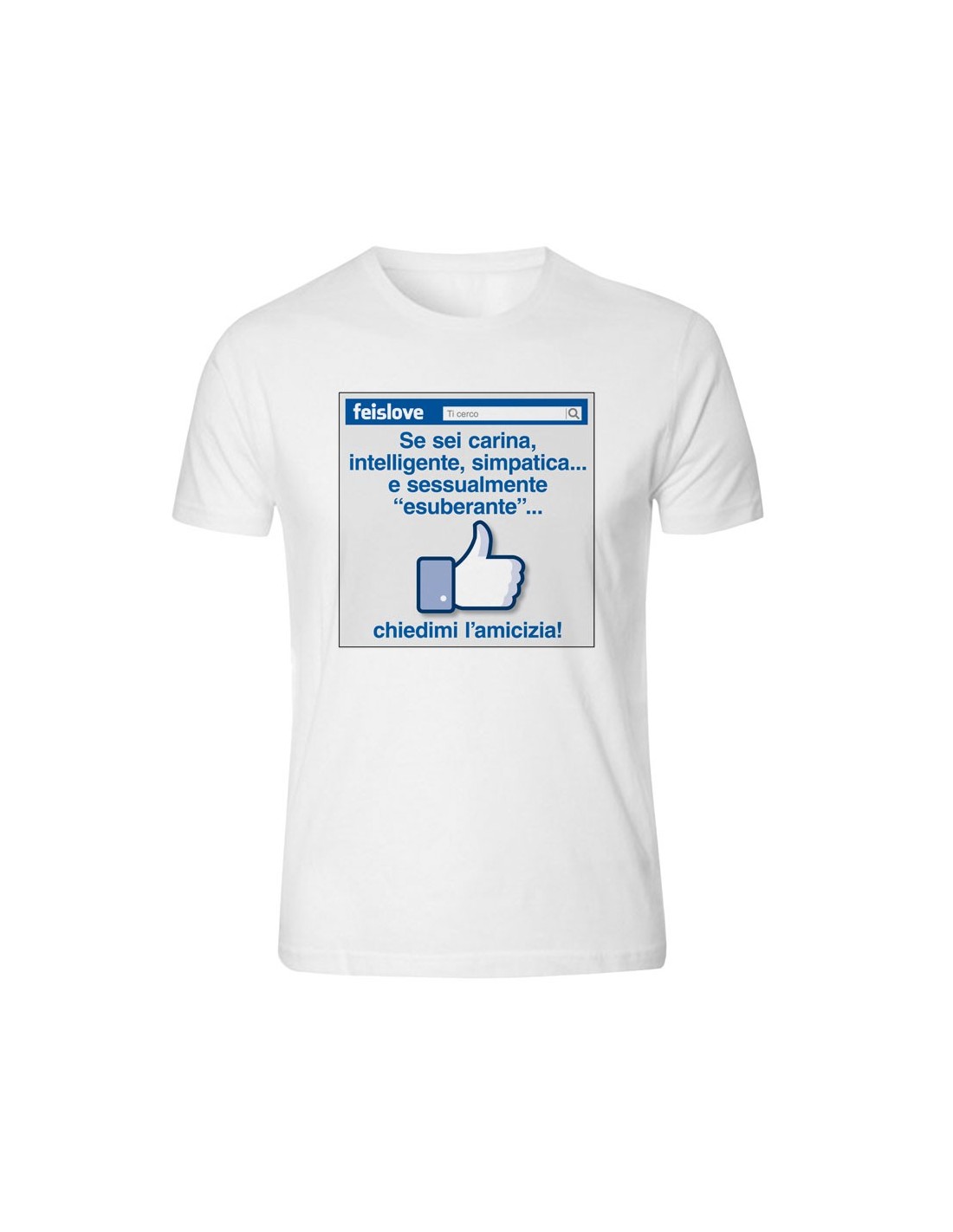 Sulla maglia campeggia il pollice celeberrimo rivolto verso l'alto che indica "mi piace". Al posto della barra di ricerca che si trova su Facebook appare la dicitura Feislove e la frase è: Se sei carina, intelligente, simpatica... e sessualmente esuberante, chiedimi l'amicizia. Si tratta di un prodotto estremamente moderno e simpatico, da indossare nelle serate in cui si va in giro con gli amici in cerca di ragazze e di nuove conoscenze. La stampa è resistente ai lavaggi fino a 40°C e la maglietta può essere messa in asciugatrice senza rovinarsi.