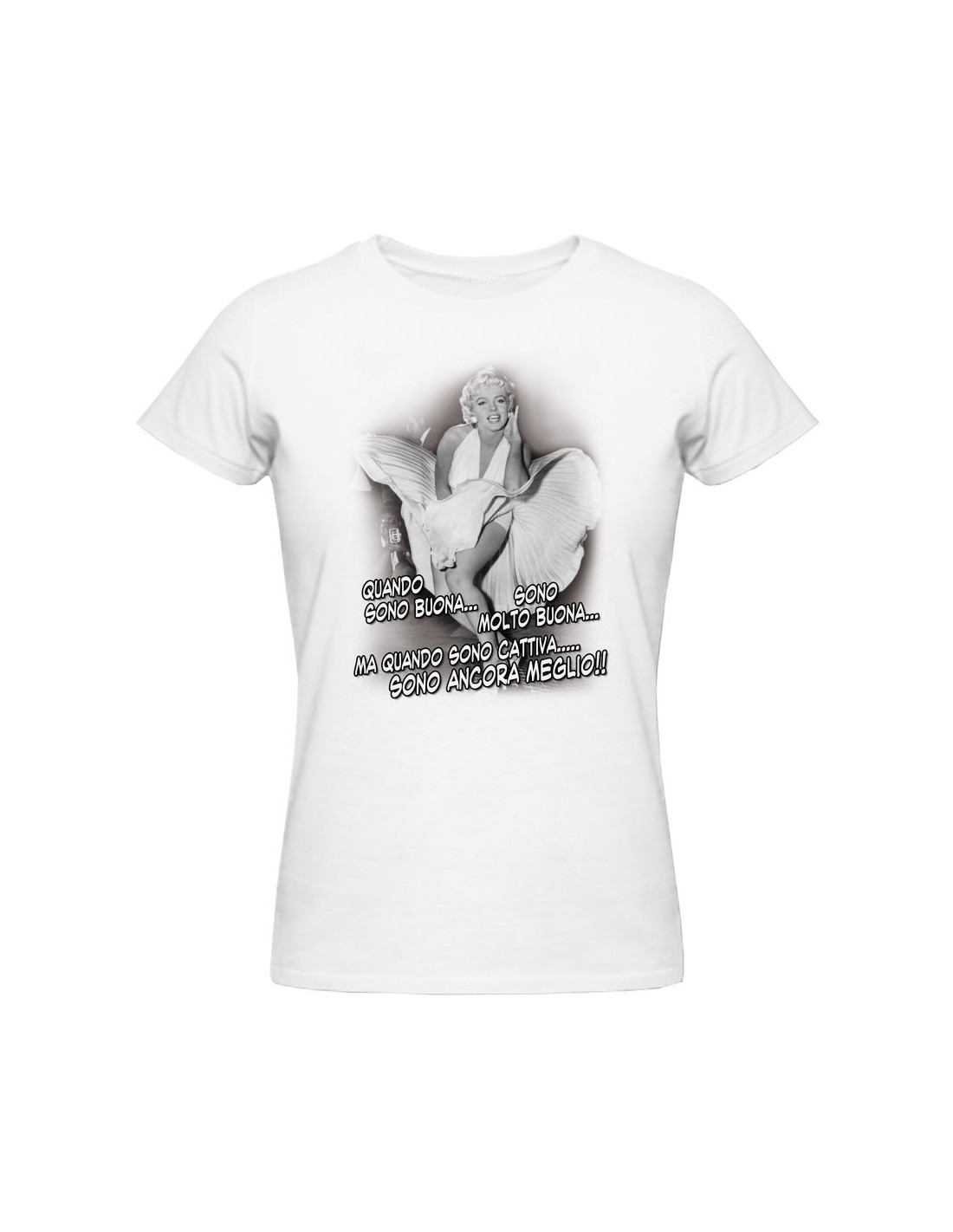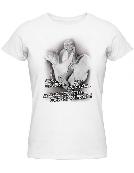Se vuoi fare un regalo simpatico a un'amica speciale, la maglietta di Marilyn Monroe è sicuramente la scelta giusta. Si tratta di una maglietta che raffigura l'iconica attrice nella scena più famosa del film " Quando la moglie è in vacanza" con la gonna plissettata svolazzante e la scollatura profonda. La scritta " quando sono buona... sono molto buona... ma quando sono cattiva sono meglio..." rende la t-shirt unica e in grado di trasmettere un messaggio positivo a tutti coloro che osservano. Tale t-shirt è di colore bianco, con un taglio moderno e morbida al tatto per dare sempre una sensazione piacevole.