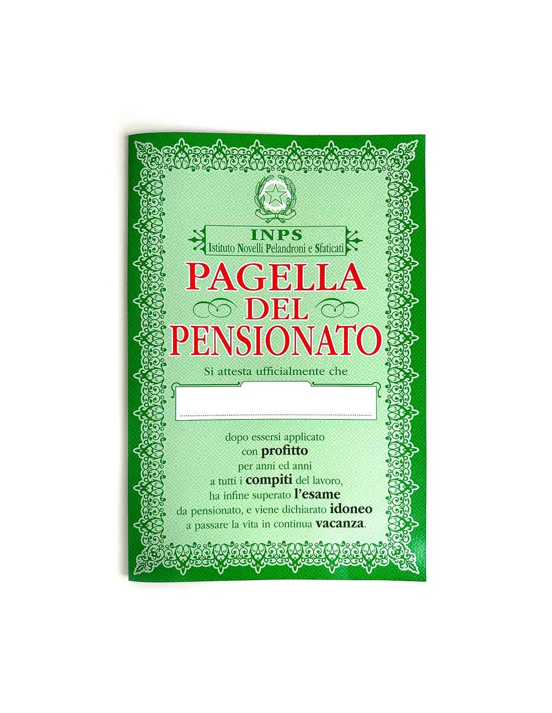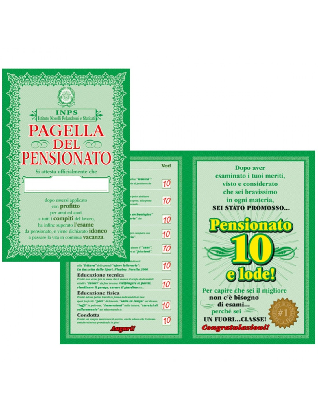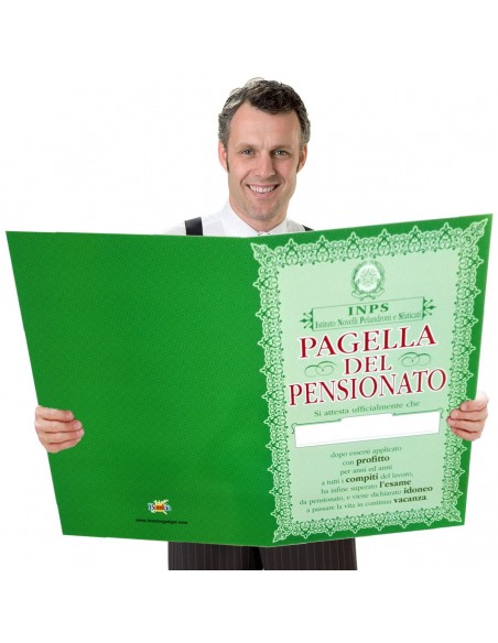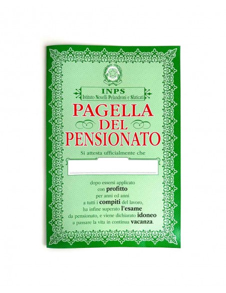 Abbiamo ideato per questo momento speciale e malinconico del pensionamento, un grande e divertente bigliettone con busta, di cm. 80 X 60, come documento speciale che INPS- Istituto Novelli Pelandroni e Sfaticati, rilascia a fine carriera lavorativa a ciascun lavoratore, per attestare e confermare con alte valutazioni la frequenza, il profitto e il risultato finale di questa Pensionato modello, dichiarandolo idoneo a rimanere, vita natural durante in vacanza.