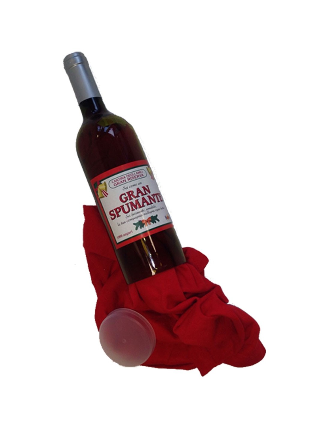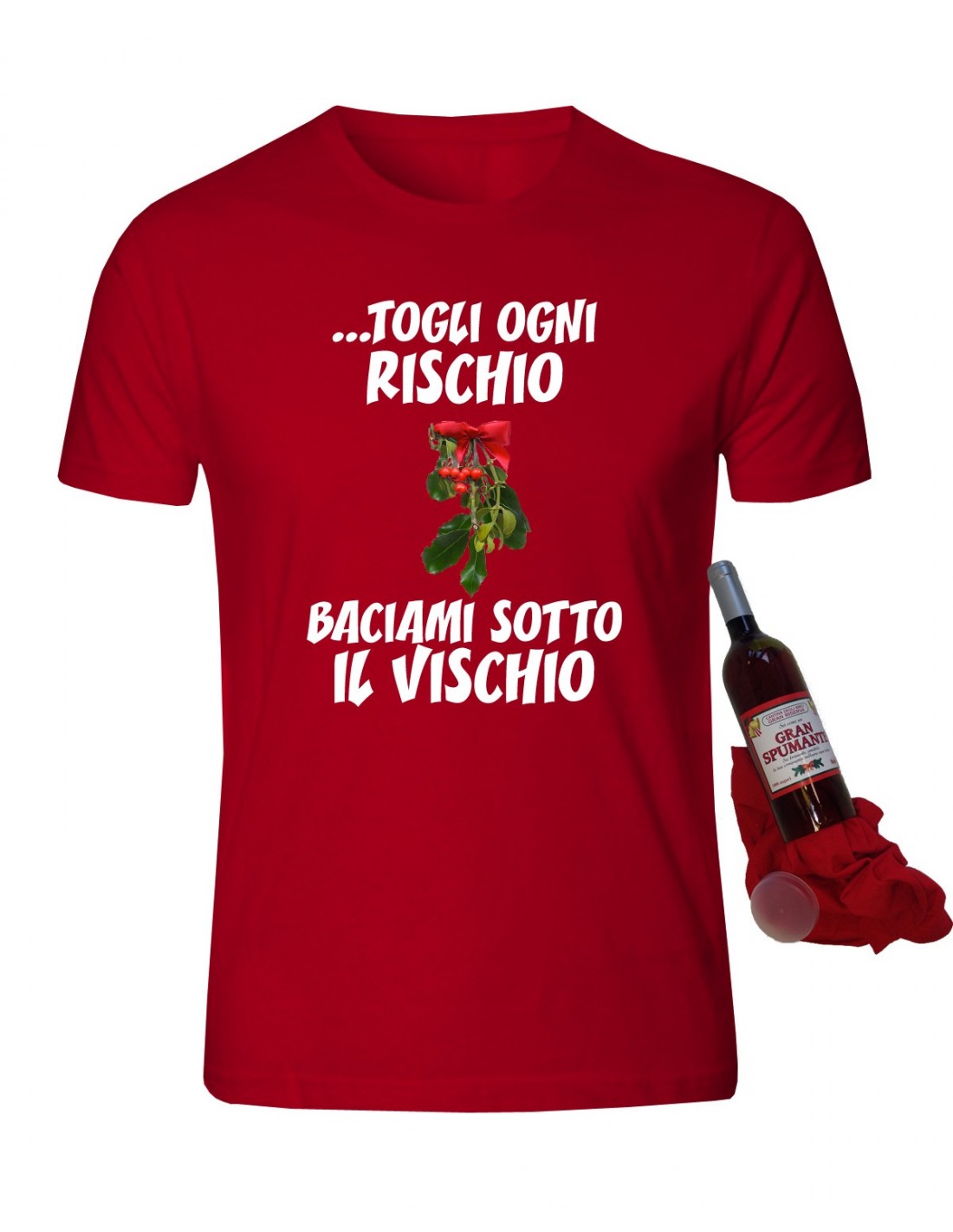 Una t-shirt rossa portafortuna contenuta in una bottiglia di vino, da indossare per farsi baciare sotto il vischio…Attenzione al doppio senso un po’ porcello!