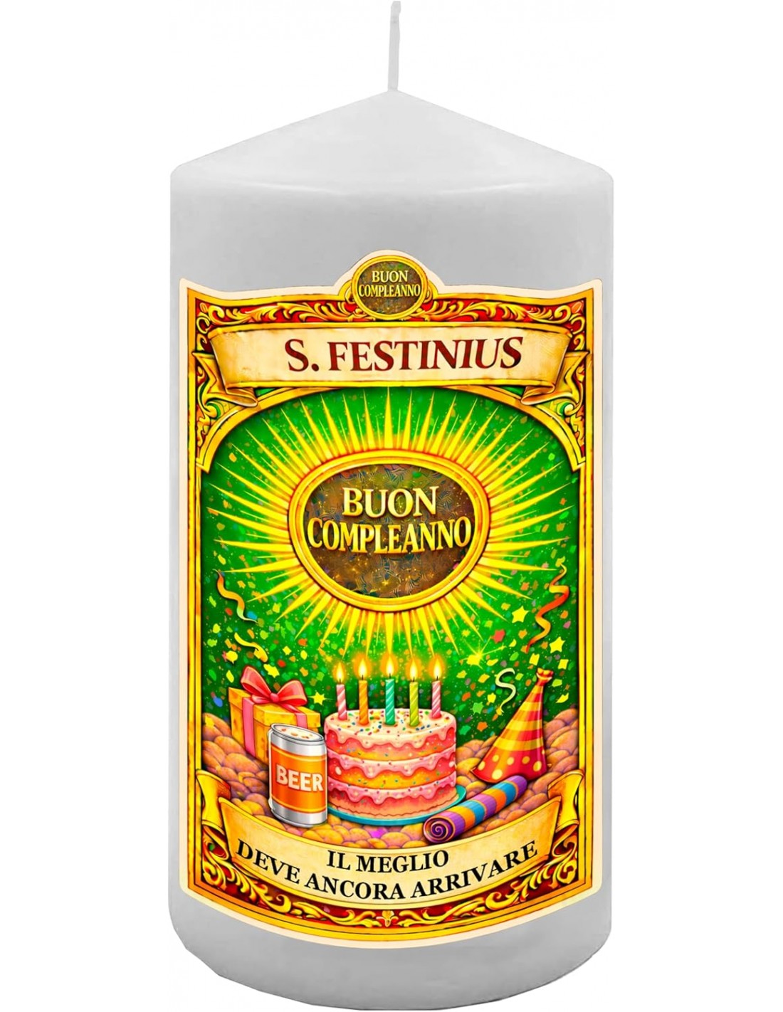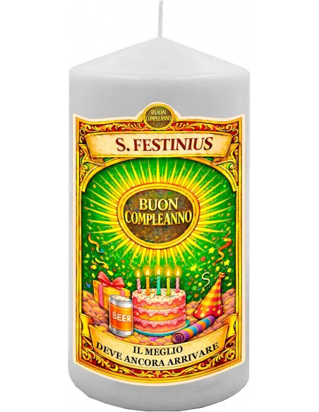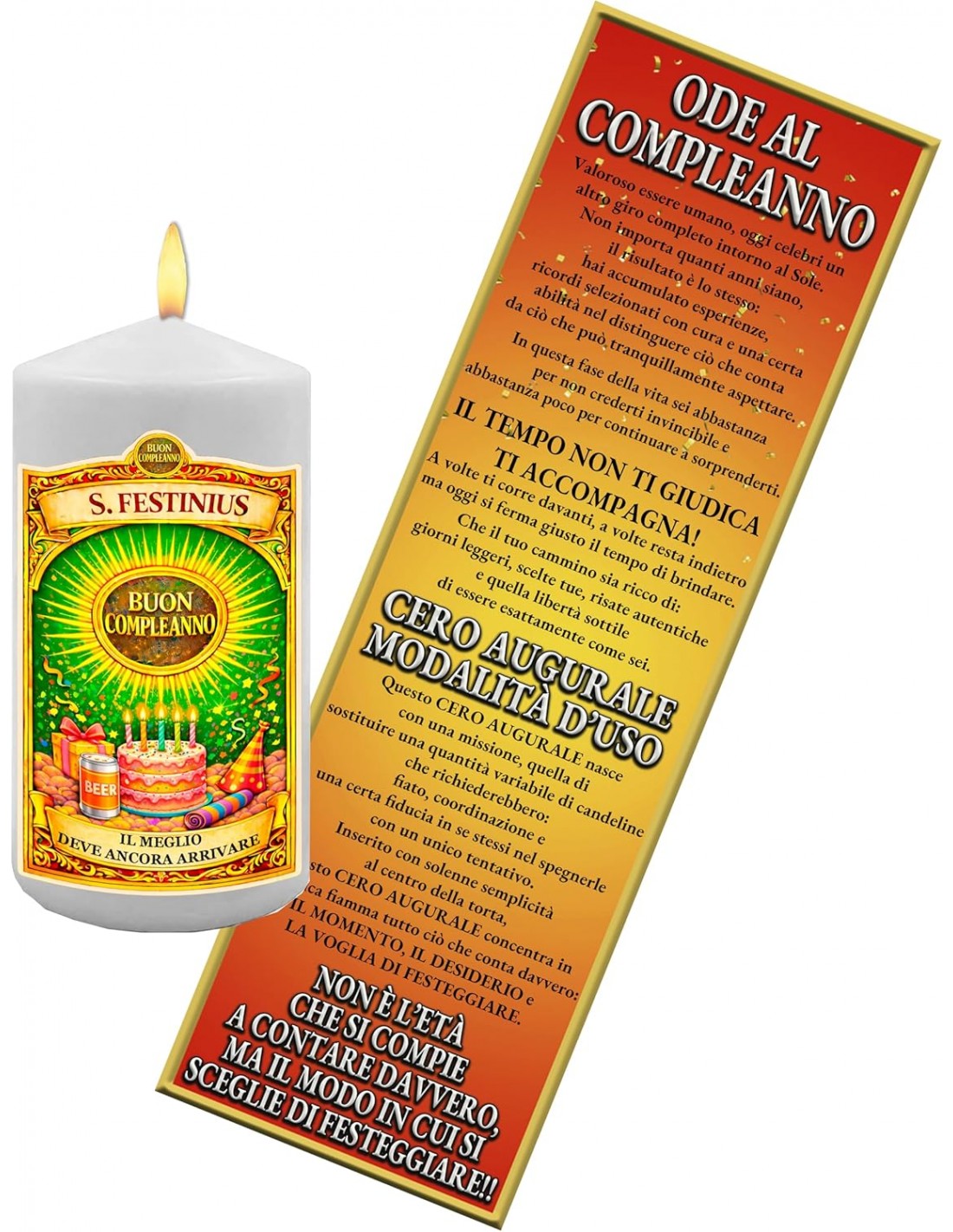 Il cero celebrativo “Per Grazia Ricevuta – Buon Compleanno” sarà il perfetto protagonista come centrotavola, sulla torta o come gadget simbolico da conservare come ricordo della Festa.