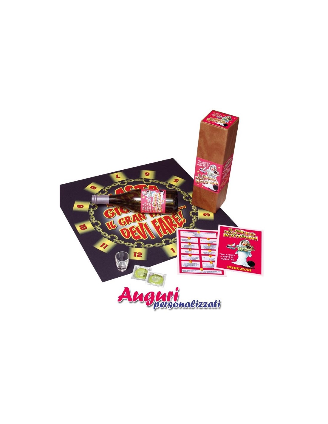 Il gioco della bottiglia per addio al nubilato è perfetto come idea regalo per una futura sposa nella sua serata di festeggiamento prima delle nozze. Le dimensioni contenute della confezione la rendono comoda e pratica da trasportare, quindi è particolarmente adatta a una serata fuori perché non occupa molto spazio. All'interno della scatola troverai: la bottiglia, il tabellone con 12 caselle disposte a cerchio, un elenco delle esilaranti prove a cui dovrà sottoporsi la sposa, un bicchiere, due preservativi e le istruzioni.
