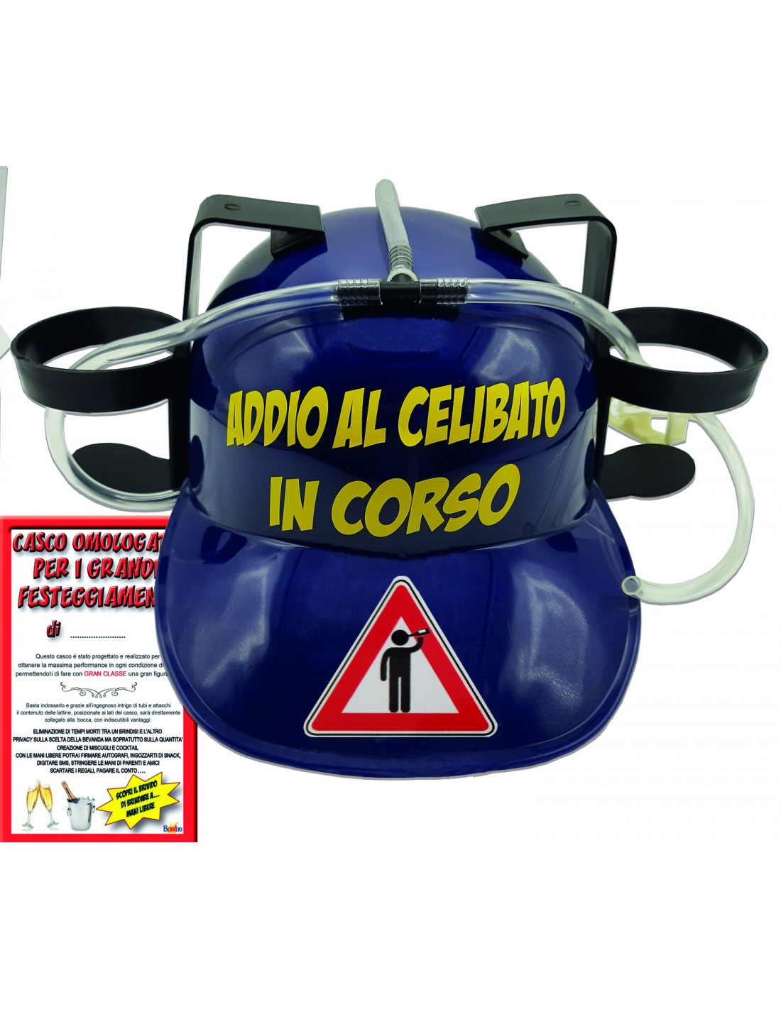 Il casco di protezione è realizzato in plastica blu, sulla parte frontale e' applicata una vivace scritta gialla "Addio al Celibato in corso" e il segnale stradale di pericolo generico. mentre sul retro del caschetto, un'altra etichetta adesiva che "certifica": Casco omologato per una grande festa.