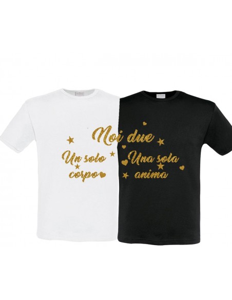 Insomma non ti mancheranno certo le occasioni per rendere felici delle coppie con questa t-shirt doppia con la scritta dorata "Noi due, un solo corpo, una sola anima" . Una maglietta per due, capo perfetto da indossare per scatti di foto ricordo e selfie dei festeggiamenti
