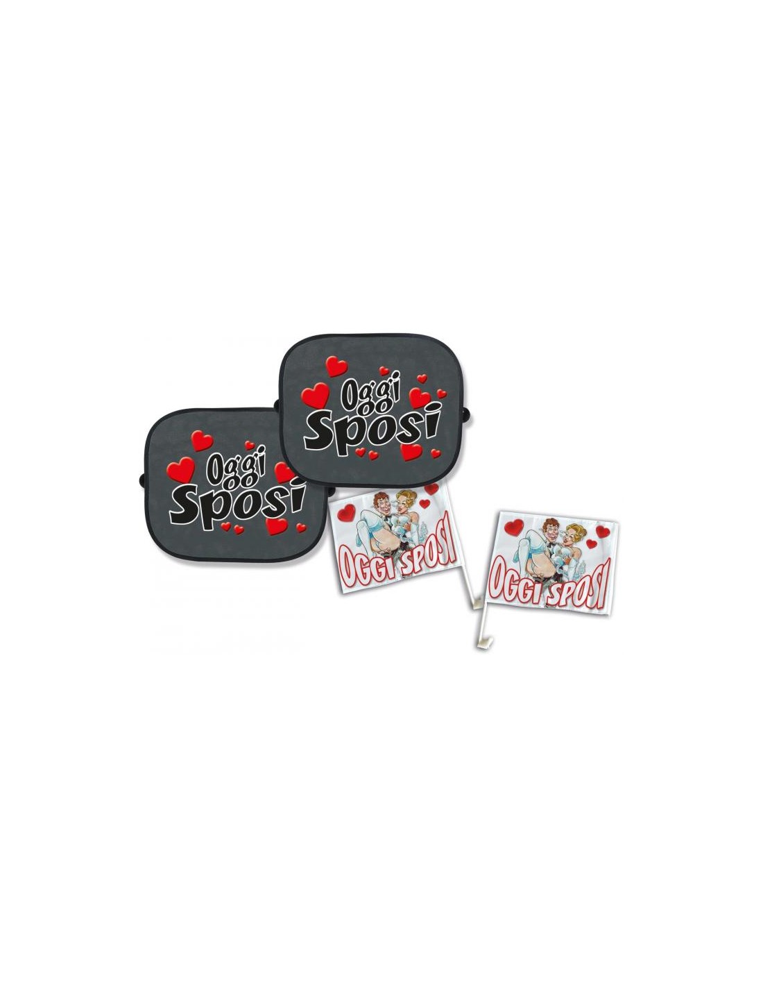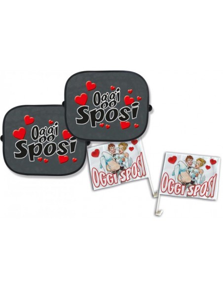 Personalizza in modo originale l’auto di questa nuova coppia con due parasole e due bandierine diplomatiche che andranno inserite ad incastro nel vetro dei finestrini senza pregiudicarne l'uso e non rovinano l'auto tutti con la scritta colorata Oggi Sposi