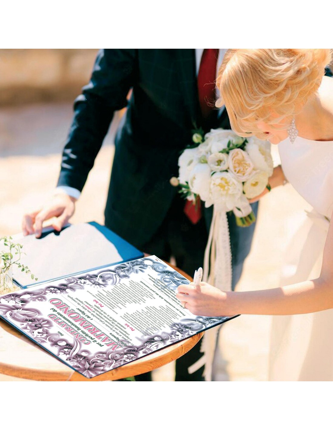 Potremo personalizzare il poster con i nomi degli sposi, mentre al momento della divertente cerimonia con consegna del contratto, gli sposi apporranno la loro firma in calce che suggellerà la loro….”condanna”
