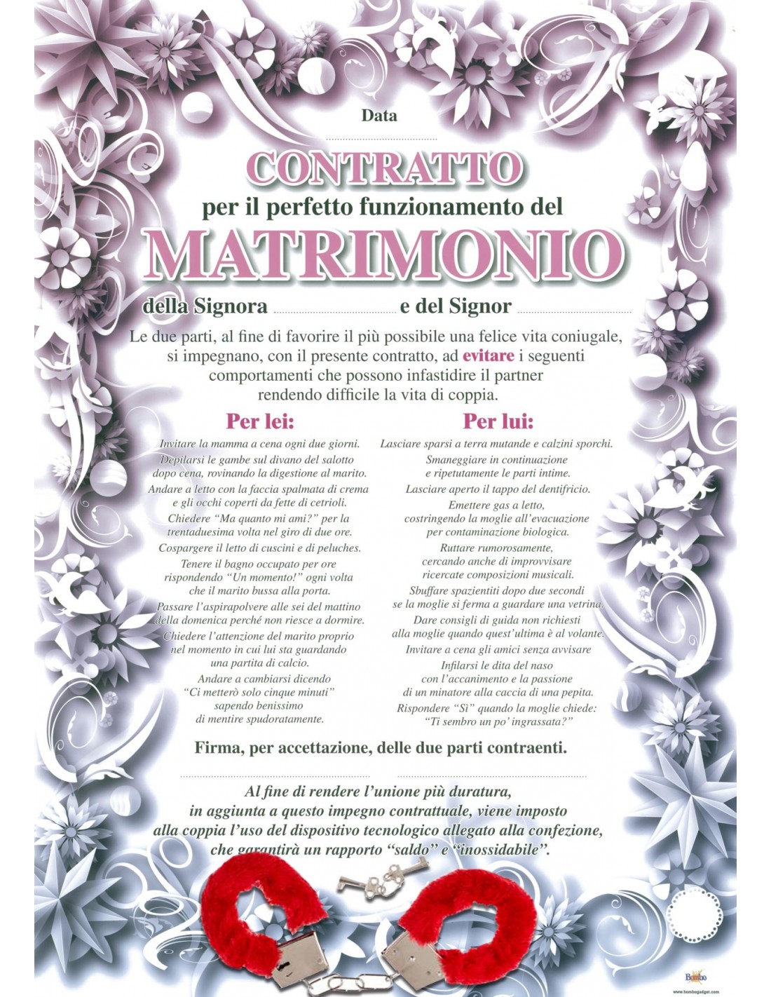 Ti proponiamo il Contratto Matrimoniale da regalare agli sposi, completato da un paio di manette in peluches, affinchè possano festeggiare sempre uniti e allegramente, firmando questo pre contratto matrimoniale, come le star americane, davanti a parenti ed amici.